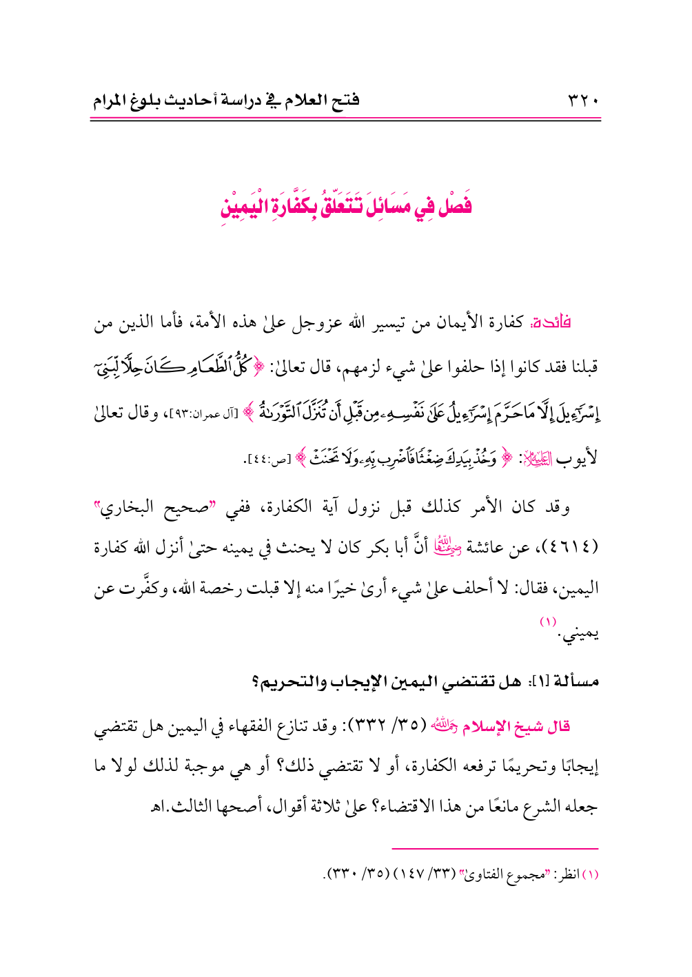 قال شيخ الإسلام -رحمه الله- (٣٥/ ٣٣٢): وقد تنازع الفقهاء في اليمين هل تقتضي إيجابًا وتحريمًا ترفعه الكفارة، أو لا تقتضي ذلك؟ أو هي موجبة لذلك لولا ما جعله الشرع مانعًا من هذا الاقتضاء؟ على ثلاثة أقوال، أصحها الثالث. اهـ