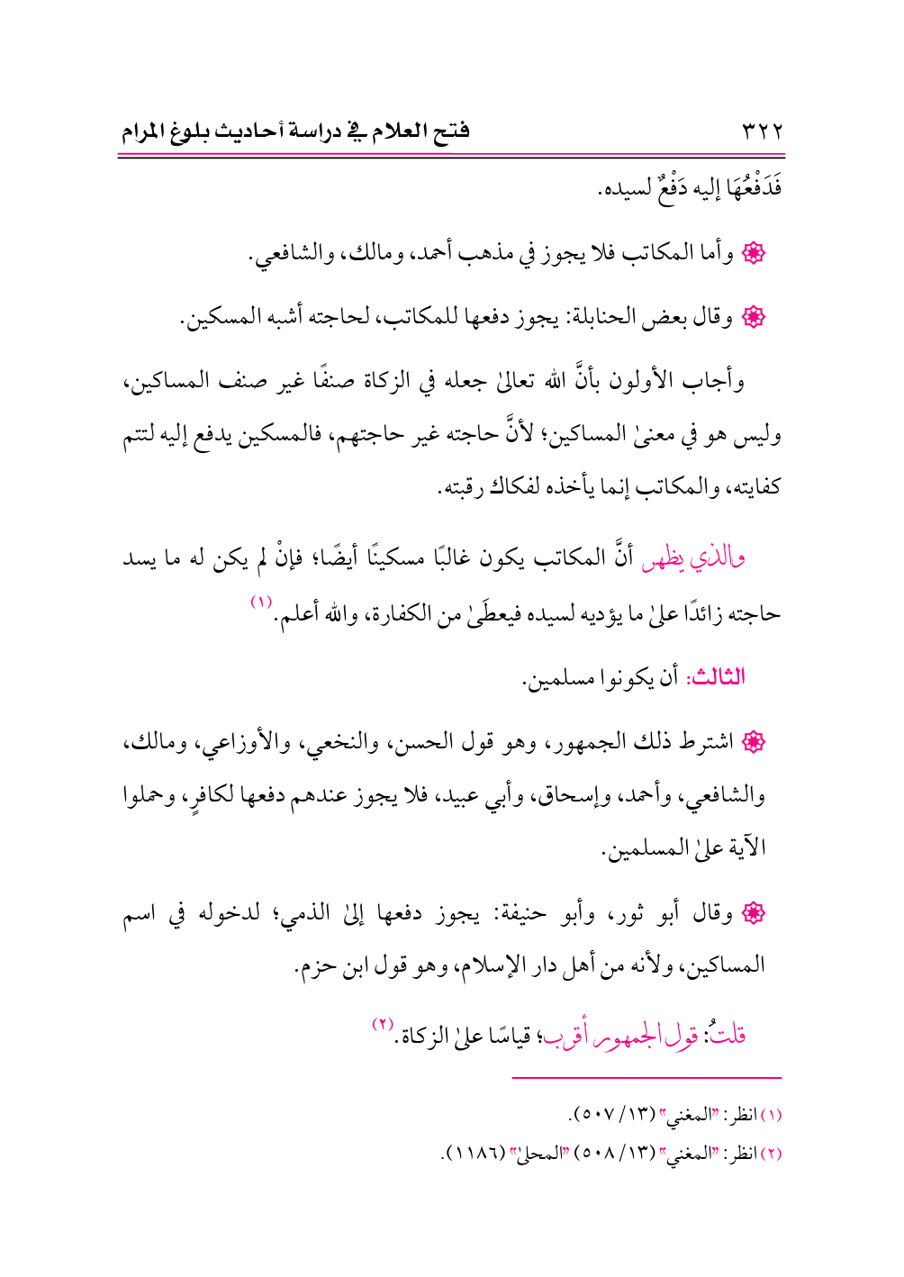 • وقال بعض الحنابلة: يجوز دفعها للمكاتب، لحاجته أشبه المسكين.