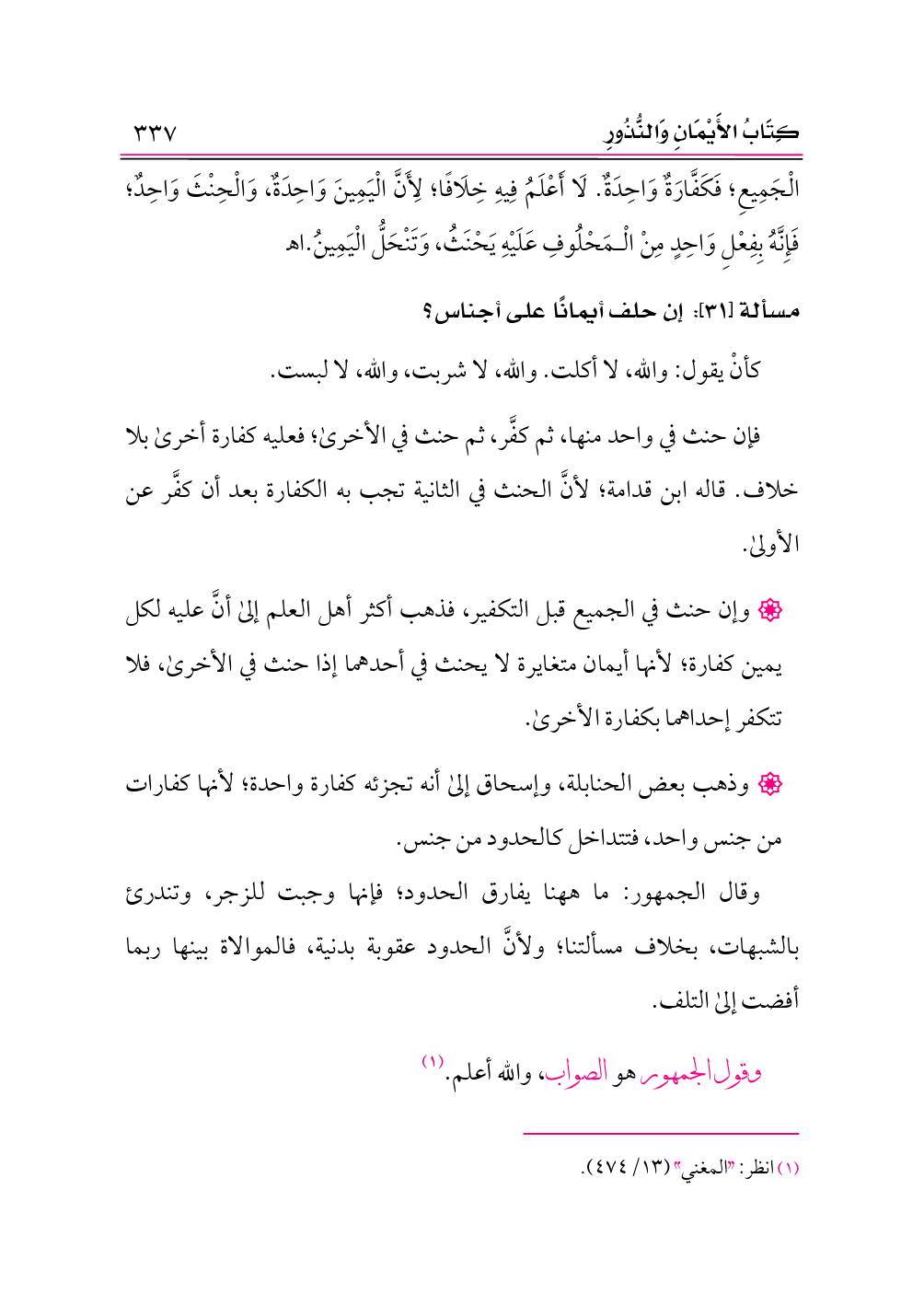 • وإن حنث في الجميع قبل التكفير، فذهب أكثر أهل العلم إلى أنَّ عليه لكل يمين كفارة؛ لأنها أيمان متغايرة لا يحنث في أحدهما إذا حنث في الأخرى، فلا تتكفر إحداهما بكفارة الأخرى.