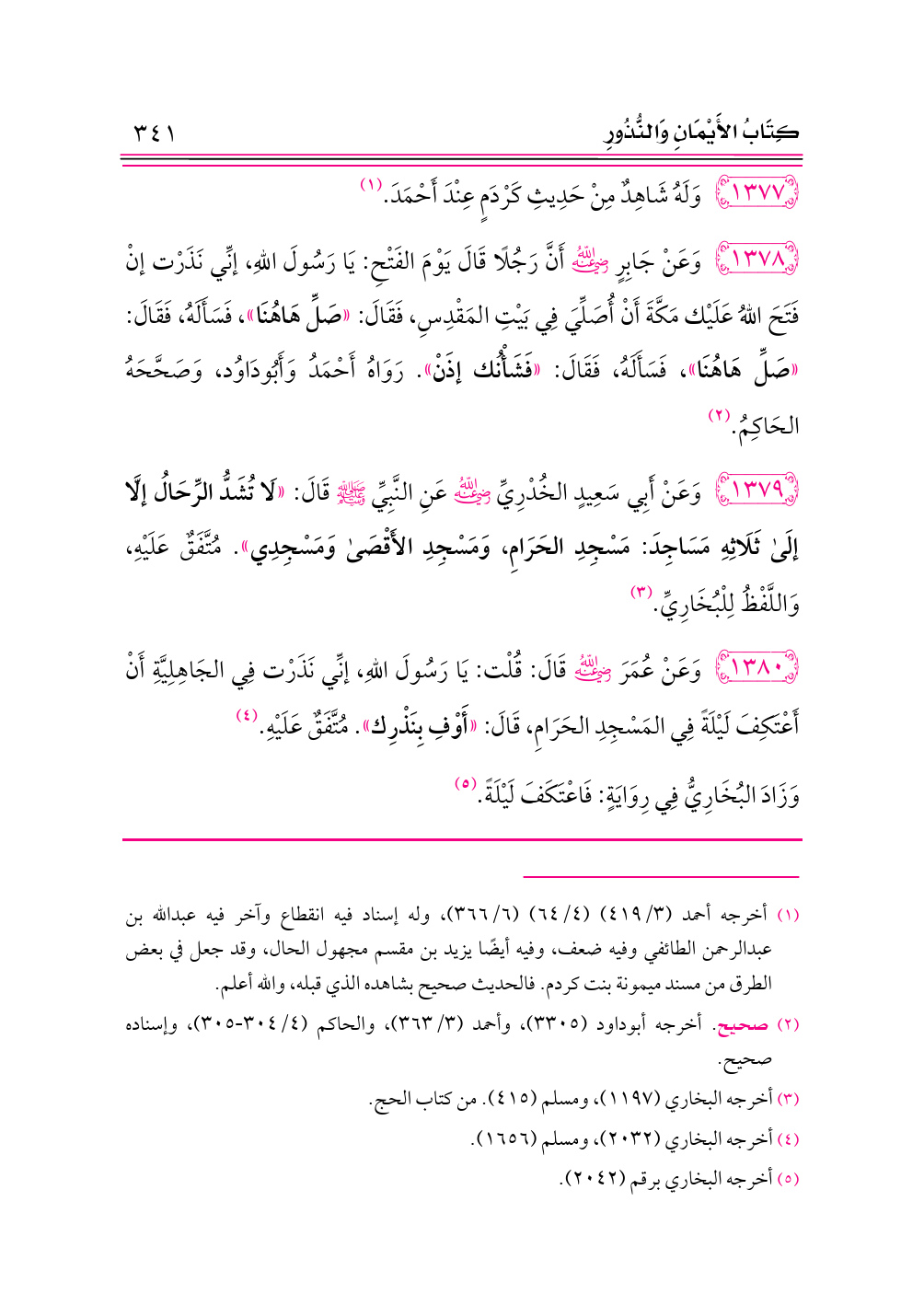 ١٣٧٨ - وَعَنْ جَابِرٍ -رضي الله عنه- أَنَّ رَجُلًا قَالَ يَوْمَ الفَتْحِ: يَا رَسُولَ اللهِ، إنِّي نَذَرْت إنْ فَتَحَ اللهُ عَلَيْك مَكَّةَ أَنْ أُصَلِّيَ فِي بَيْتِ المَقْدِسِ، فَقَالَ: «صَلِّ هَاهُنَا»، فَسَأَلَهُ، فَقَالَ: «صَلِّ هَاهُنَا»، فَسَأَلَهُ، فَقَالَ: «فَشَأْنُك إذَنْ». رَوَاهُ أَحْمَدُ وَأَبُودَاوُد، وَصَحَّحَهُ الحَاكِمُ. (¬٢)