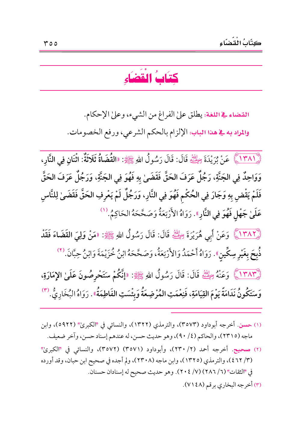 ١٣٨٢ - وَعَنْ أَبِي هُرَيْرَةَ -رضي الله عنه- قَالَ: قَالَ رَسُولُ اللهِ - صلى الله عليه وسلم -: «مَنْ وَلِيَ القَضَاءَ فَقَدْ ذُبِحَ بِغَيْرِ سِكِّينٍ». رَوَاهُ أَحْمَدُ وَالأَرْبَعَةُ، وَصَحَّحَهُ ابْنُ خُزَيْمَةَ وَابْنُ حِبَّانَ. (¬٢)