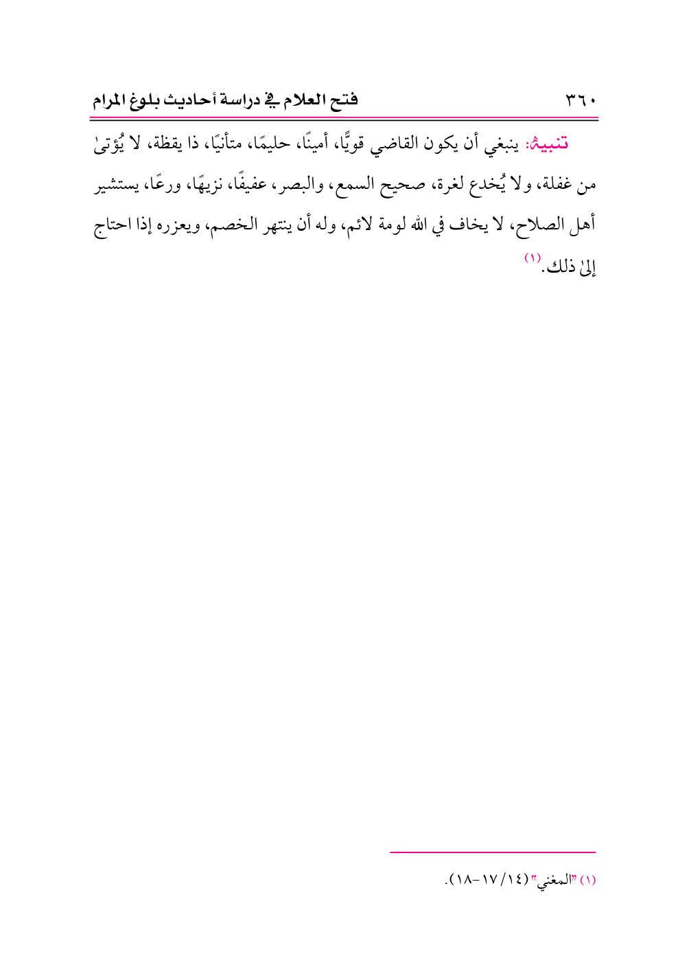 تنبيه: ينبغي أن يكون القاضي قويًّا، أمينًا، حليمًا، متأنيًا، ذا يقظة، لا يُؤتى من غفلة، ولا يُخدع لغرة، صحيح السمع، والبصر، عفيفًا، نزيهًا، ورعًا، يستشير أهل الصلاح، لا يخاف في الله لومة لائم، وله أن ينتهر الخصم، ويعزره إذا احتاج إلى ذلك. (¬١)