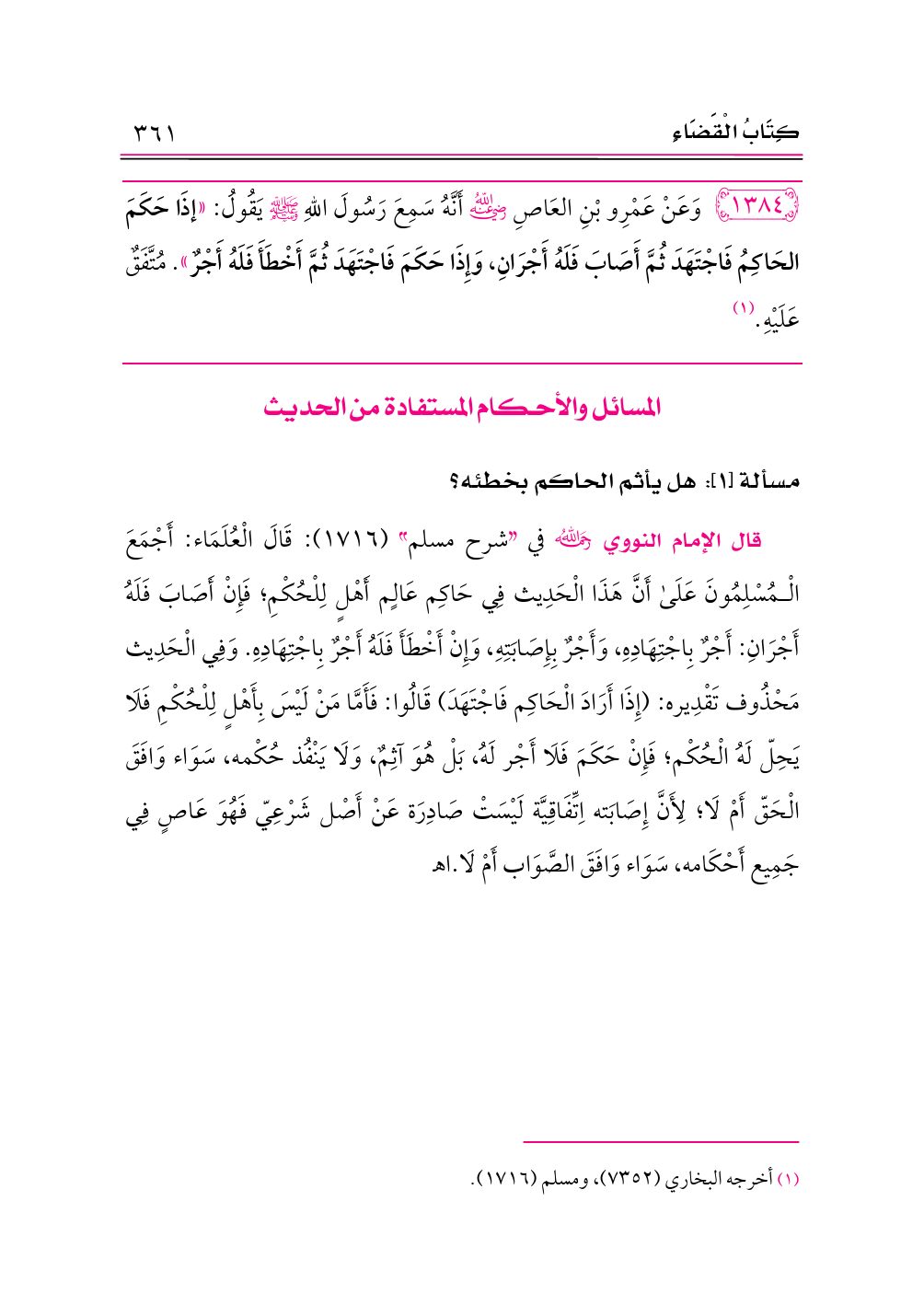١٣٨٤ - وَعَنْ عَمْرِو بْنِ العَاصِ -رضي الله عنه- أَنَّهُ سَمِعَ رَسُولَ اللهِ - صلى الله عليه وسلم - يَقُولُ: «إذَا حَكَمَ الحَاكِمُ فَاجْتَهَدَ ثُمَّ أَصَابَ فَلَهُ أَجْرَانِ، وَإِذَا حَكَمَ فَاجْتَهَدَ ثُمَّ أَخْطَأَ فَلَهُ أَجْرٌ». مُتَّفَقٌ عَلَيْهِ. (¬١)