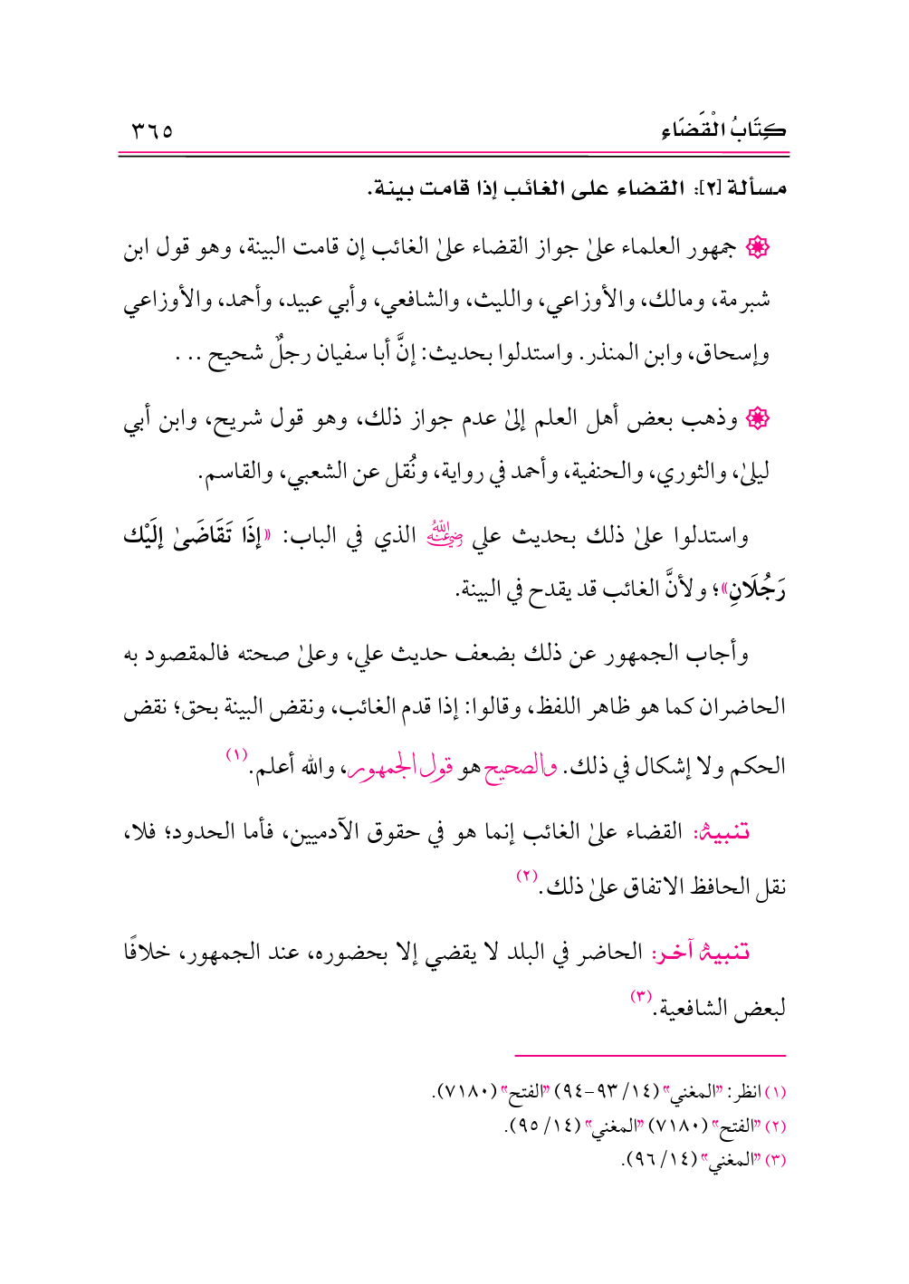 تنبيه آخر: الحاضر في البلد لا يقضي إلا بحضوره، عند الجمهور، خلافًا لبعض الشافعية. (¬٣)
