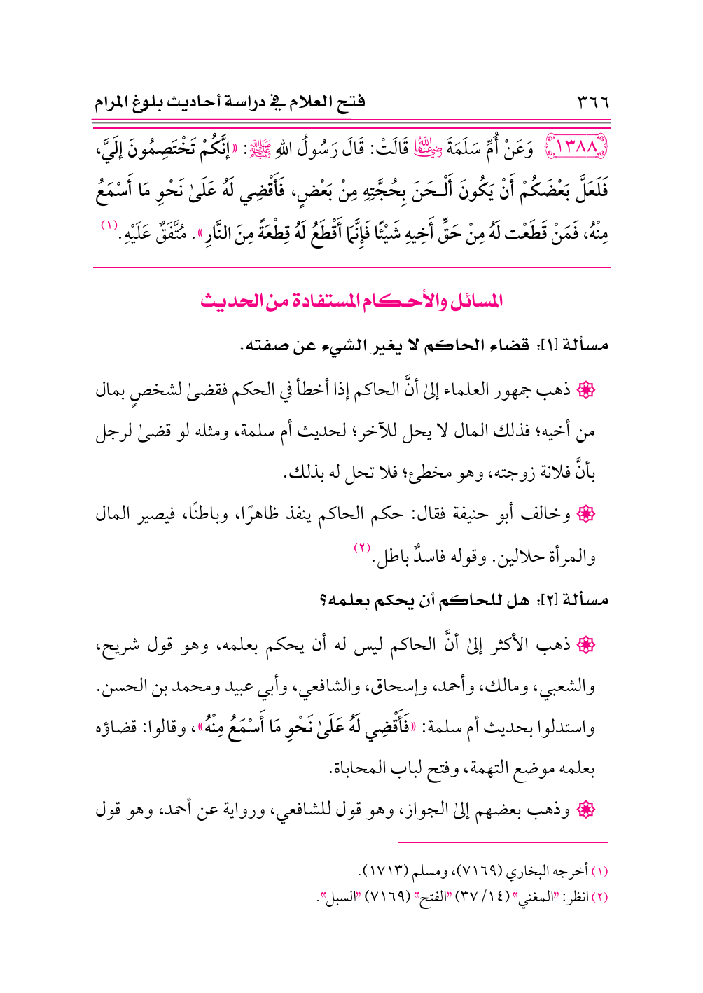 • ذهب جمهور العلماء إلى أنَّ الحاكم إذا أخطأ في الحكم فقضى لشخصٍ بمال من أخيه؛ فذلك المال لا يحل للآخر؛ لحديث أم سلمة، ومثله لو قضى لرجل بأنَّ فلانة زوجته، وهو مخطئ؛ فلا تحل له بذلك.
