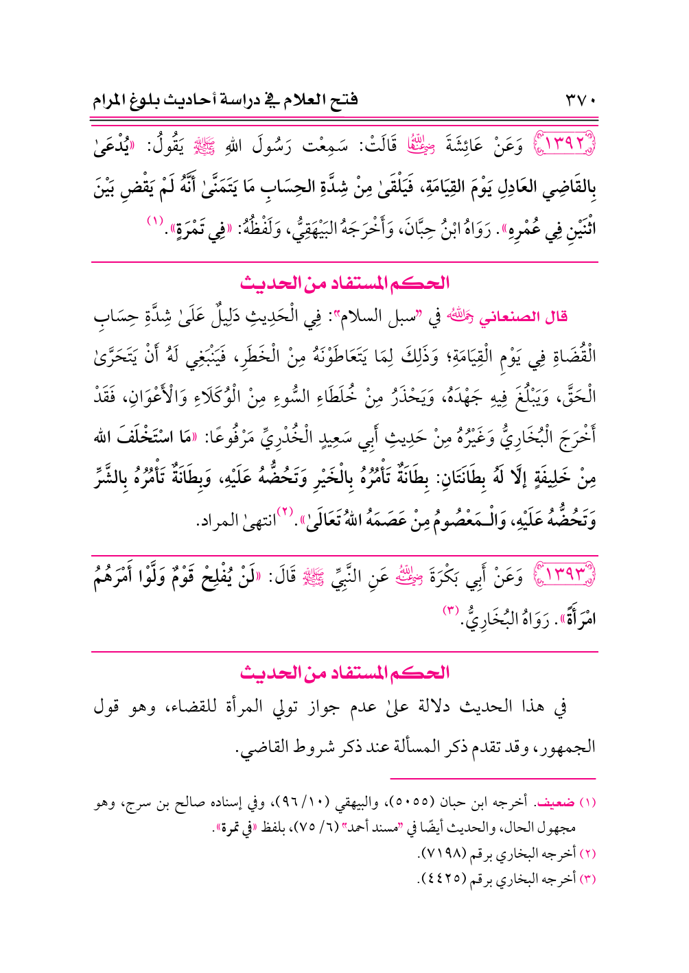 ١٣٩٣ - وَعَنْ أَبِي بَكْرَةَ -رضي الله عنه- عَنِ النَّبِيِّ - صلى الله عليه وسلم - قَالَ: «لَنْ يُفْلِحْ قَوْمٌ وَلَّوْا أَمْرَهُمُ امْرَأَةً». رَوَاهُ البُخَارِيُّ. (¬٣)