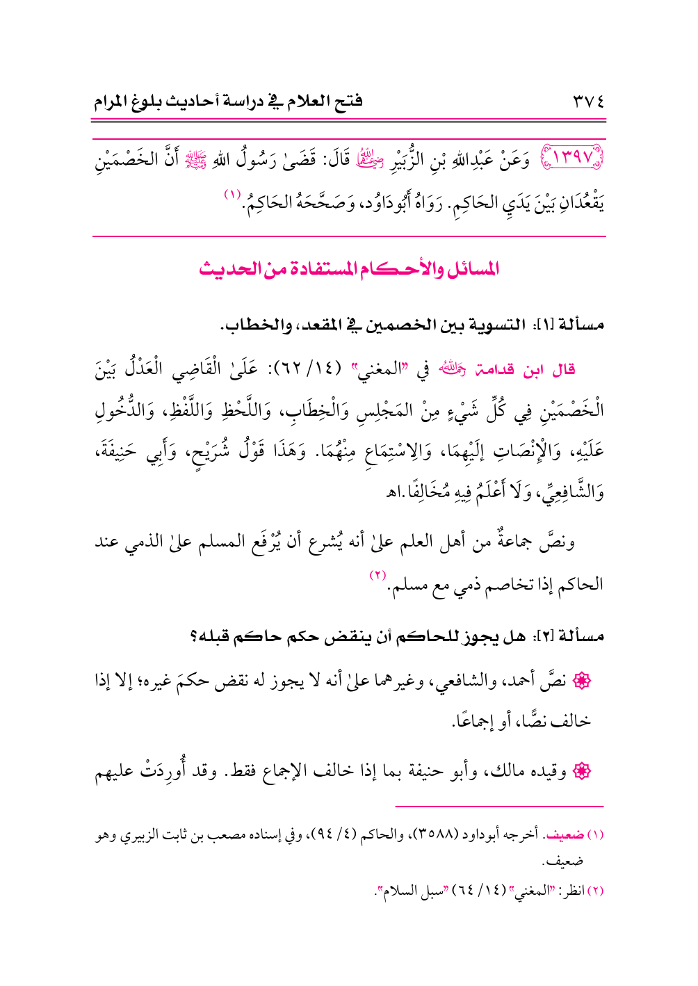١٣٩٧ - وَعَنْ عَبْدِاللهِ بْنِ الزُّبَيْرِ -رضي الله عنهما- قَالَ: قَضَى رَسُولُ اللهِ - صلى الله عليه وسلم - أَنَّ الخَصْمَيْنِ يَقْعُدَانِ بَيْنَ يَدَيِ الحَاكِمِ. رَوَاهُ أَبُودَاوُد، وَصَحَّحَهُ الحَاكِمُ. (¬١)
