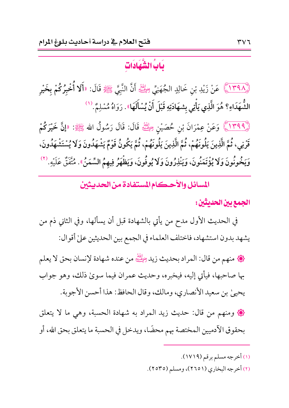 • منهم من قال: المراد بحديث زيد -رضي الله عنه- من عنده شهادة لإنسان بحق لا يعلم بها صاحبها، فيأتي إليه، فيخبره، وحديث عمران فيما سوى ذلك، وهو جواب يحيى بن سعيد الأنصاري، ومالك، وقال الحافظ: هذا أحسن الأجوبة.
