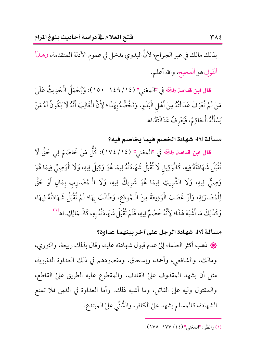 قال ابن قدامة -رحمه الله- في «المغني» (١٤/ ١٤٩ - ١٥٠): وَيُحْمَلُ الْحَدِيثُ عَلَى مَنْ لَمْ تُعْرَفْ عَدَالَتُهُ مِنْ أَهْلِ الْبَدْوِ، وَنَخُصُّهُ بِهَذَا؛ لِأَنَّ الْغَالِبَ أَنَّهُ لَا يَكُونُ لَهُ مَنْ يَسْأَلُهُ الْحَاكِمُ، فَيَعْرِفُ عَدَالَتَهُ. اهـ