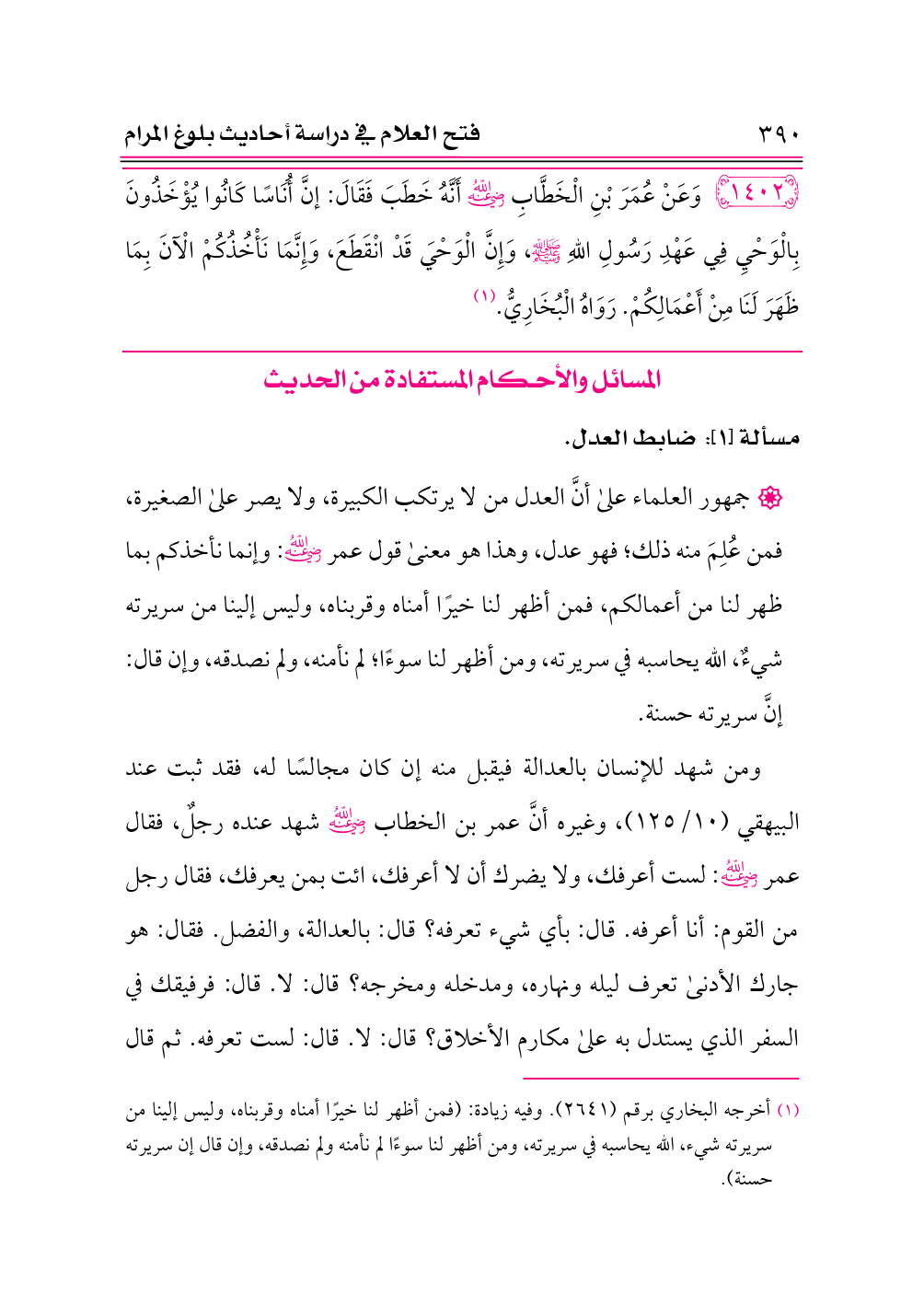 ١٤٠٢ - وَعَنْ عُمَرَ بْنِ الْخَطَّابِ -رضي الله عنه- أَنَّهُ خَطَبَ فَقَالَ: إنَّ أُنَاسًا كَانُوا يُؤْخَذُونَ بِالْوَحْيِ فِي عَهْدِ رَسُولِ اللهِ - صلى الله عليه وسلم -، وَإِنَّ الْوَحْيَ قَدْ انْقَطَعَ، وَإِنَّمَا نَأْخُذُكُمْ الْآنَ بِمَا ظَهَرَ لَنَا مِنْ أَعْمَالِكُمْ. رَوَاهُ الْبُخَارِيُّ. (¬١)