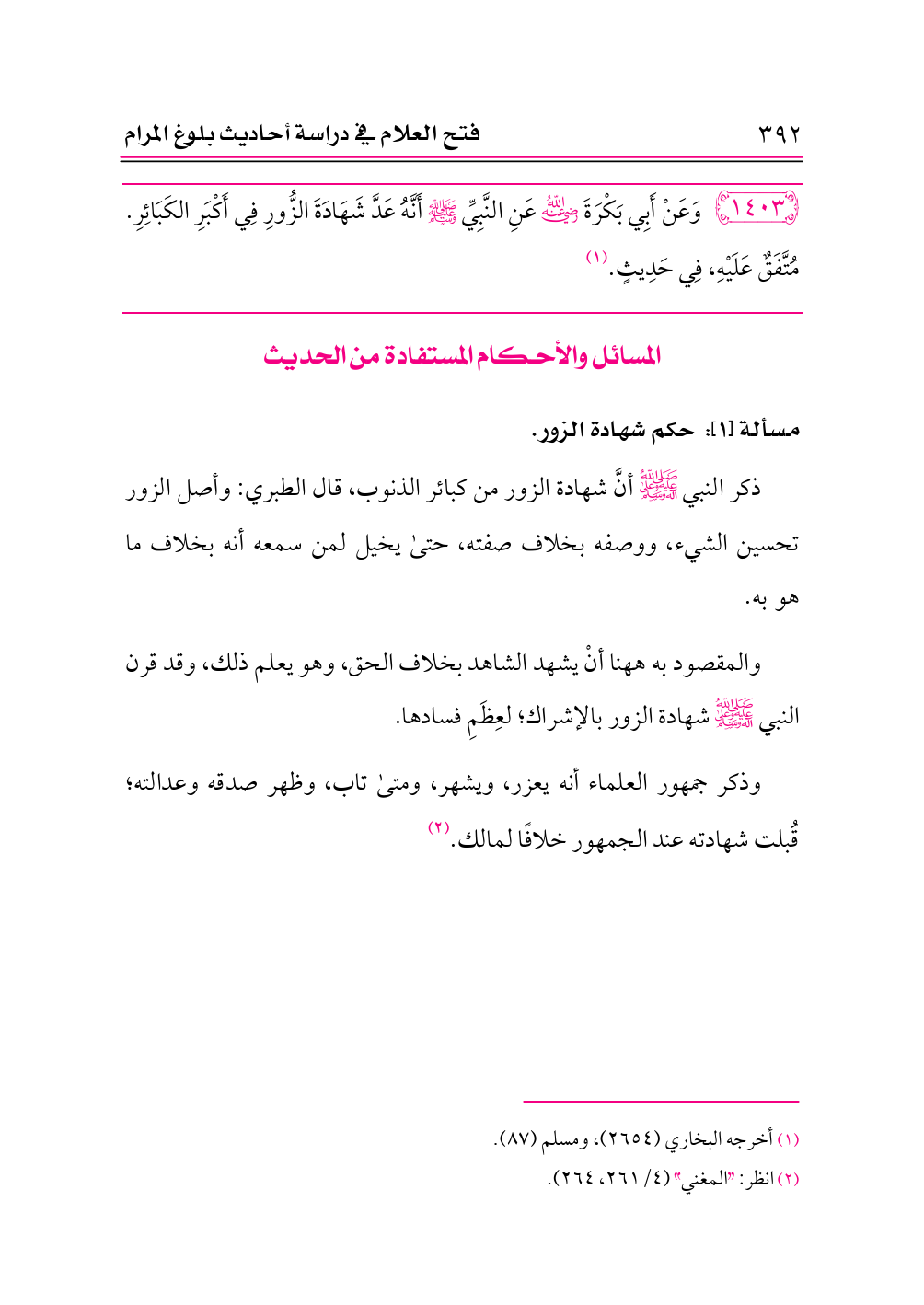 ١٤٠٣ - وَعَنْ أَبِي بَكْرَةَ -رضي الله عنه- عَنِ النَّبِيِّ - صلى الله عليه وسلم - أَنَّهُ عَدَّ شَهَادَةَ الزُّورِ فِي أَكْبَرِ الكَبَائِرِ. مُتَّفَقٌ عَلَيْهِ، فِي حَدِيثٍ. (¬١)