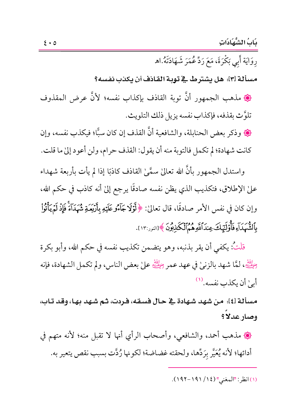 مسألة [٣]: هل يشترط في توبة القاذف أن يكذب نفسه؟