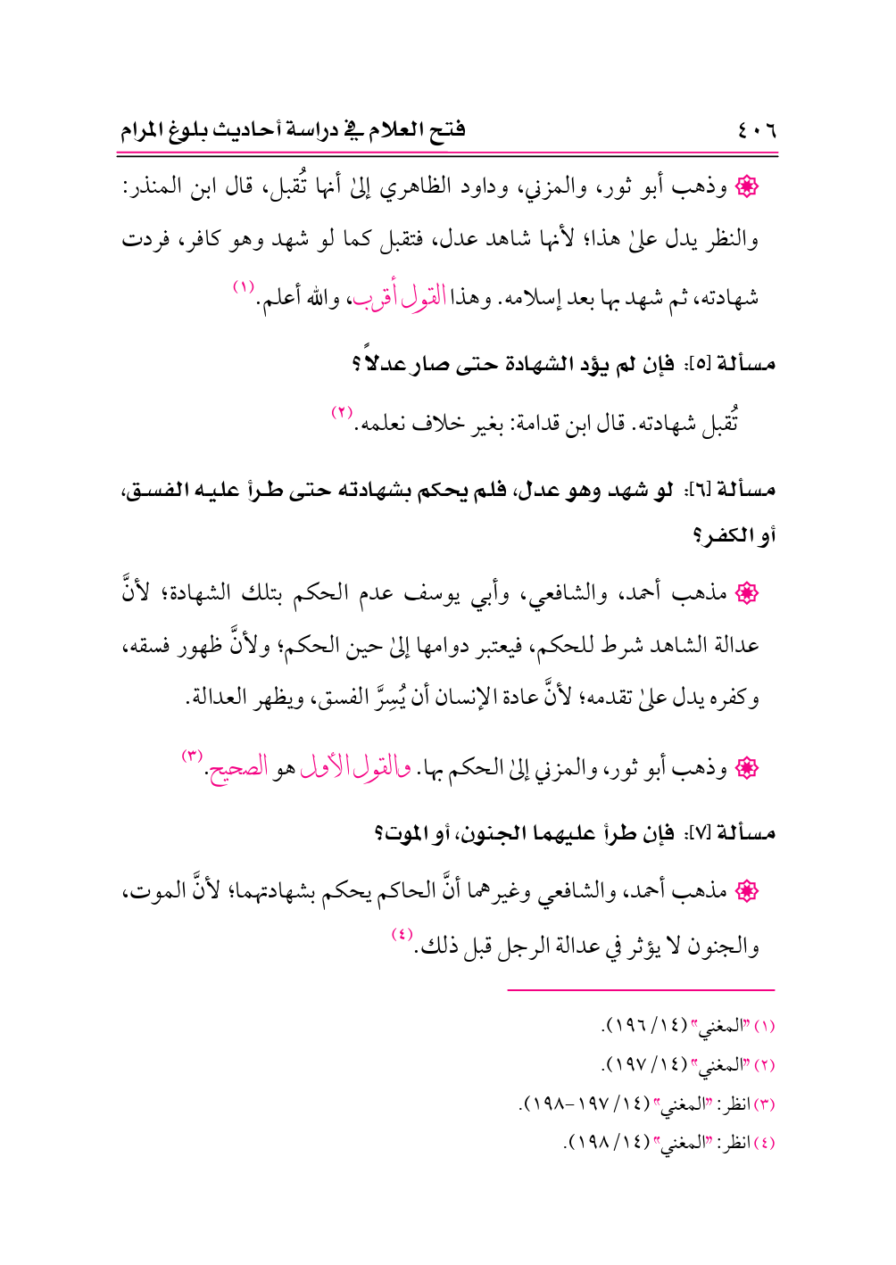 • مذهب أحمد، والشافعي وغيرهما أنَّ الحاكم يحكم بشهادتهما؛ لأنَّ الموت، والجنون لا يؤثر في عدالة الرجل قبل ذلك. (¬٤)