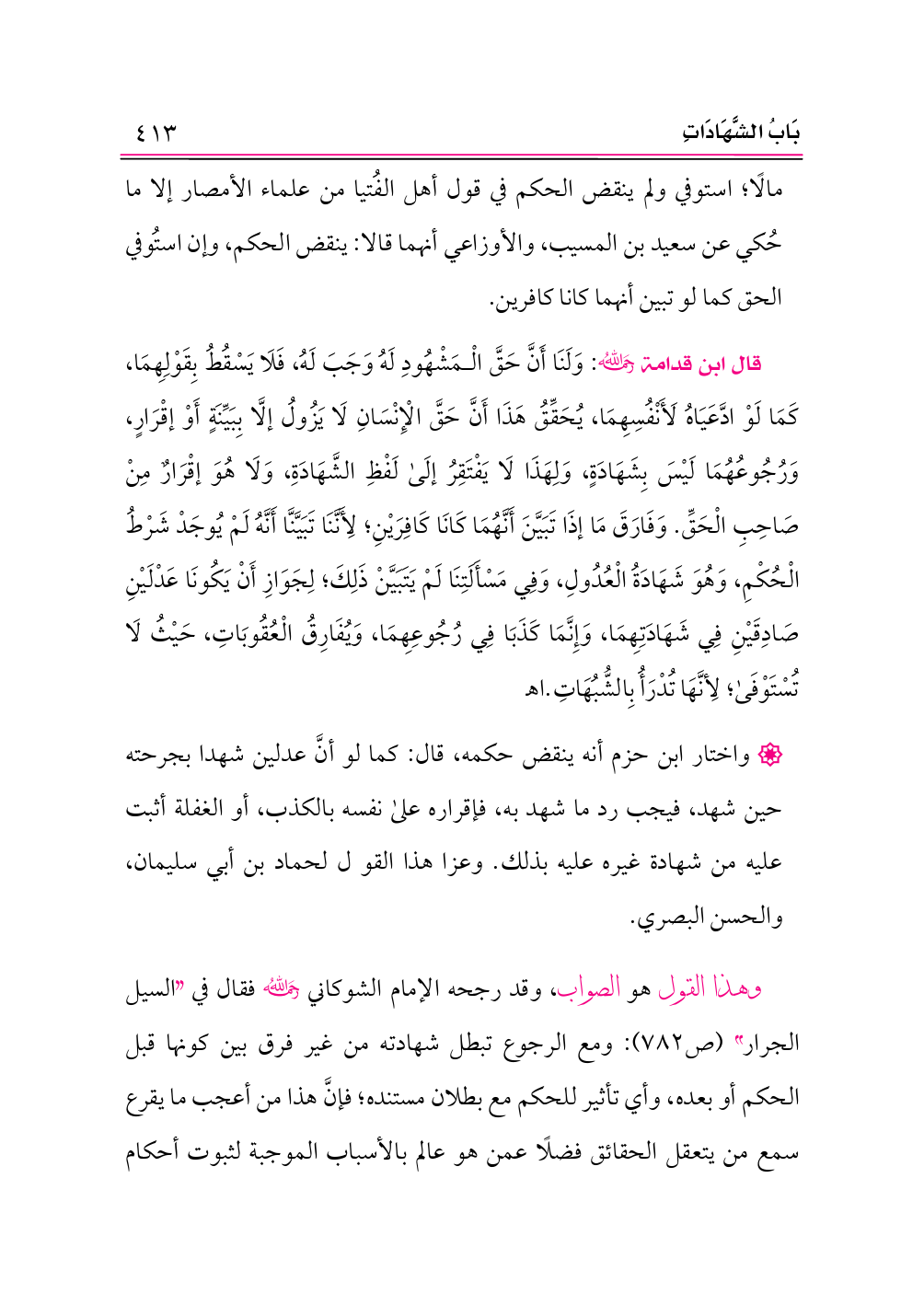 وهذا القول هو الصواب، وقد رجحه الإمام الشوكاني -رحمه الله- فقال في «السيل الجرار» (ص ٧٨٢): ومع الرجوع تبطل شهادته من غير فرق بين كونها قبل الحكم أو بعده، وأي تأثير للحكم مع بطلان مستنده؛ فإنَّ هذا من أعجب ما يقرع سمع من يتعقل الحقائق فضلًا عمن هو عالم بالأسباب الموجبة لثبوت أحكام