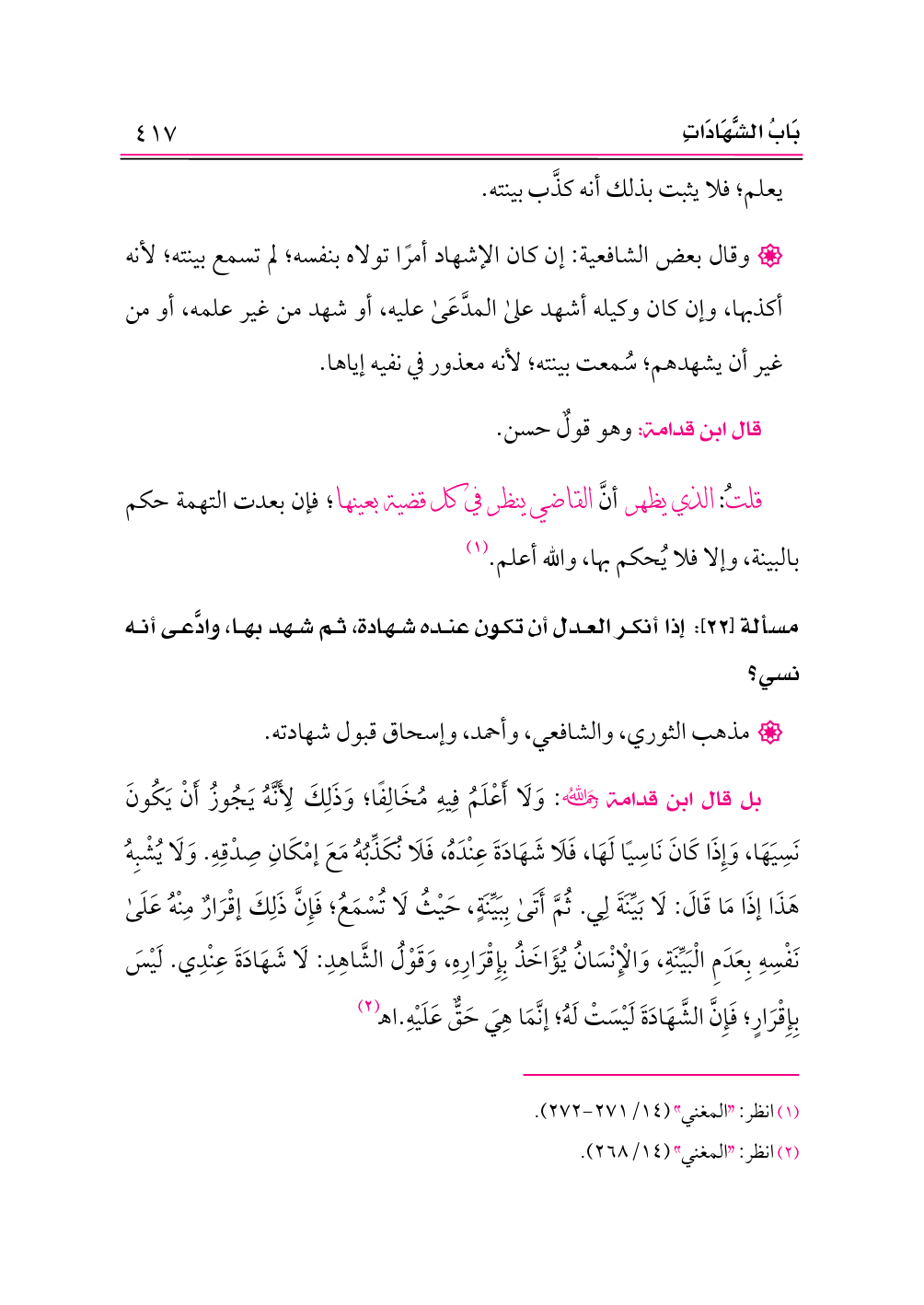 بل قال ابن قدامة -رحمه الله-: وَلَا أَعْلَمُ فِيهِ مُخَالِفًا؛ وَذَلِكَ لِأَنَّهُ يَجُوزُ أَنْ يَكُونَ نَسِيَهَا، وَإِذَا كَانَ نَاسِيًا لَهَا، فَلَا شَهَادَةَ عِنْدَهُ، فَلَا نُكَذِّبُهُ مَعَ إمْكَانِ صِدْقِهِ. وَلَا يُشْبِهُ هَذَا إذَا مَا قَالَ: لَا بَيِّنَةَ لِي. ثُمَّ أَتَى بِبَيِّنَةٍ، حَيْثُ لَا تُسْمَعُ؛ فَإِنَّ ذَلِكَ إقْرَارٌ مِنْهُ عَلَى نَفْسِهِ بِعَدَمِ الْبَيِّنَةِ، وَالْإِنْسَانُ يُؤَاخَذُ بِإِقْرَارِهِ، وَقَوْلُ الشَّاهِدِ: لَا شَهَادَةَ عِنْدِي. لَيْسَ بِإِقْرَارٍ؛ فَإِنَّ الشَّهَادَةَ لَيْسَتْ لَهُ؛ إنَّمَا هِيَ حَقٌّ عَلَيْهِ. اهـ (¬٢)