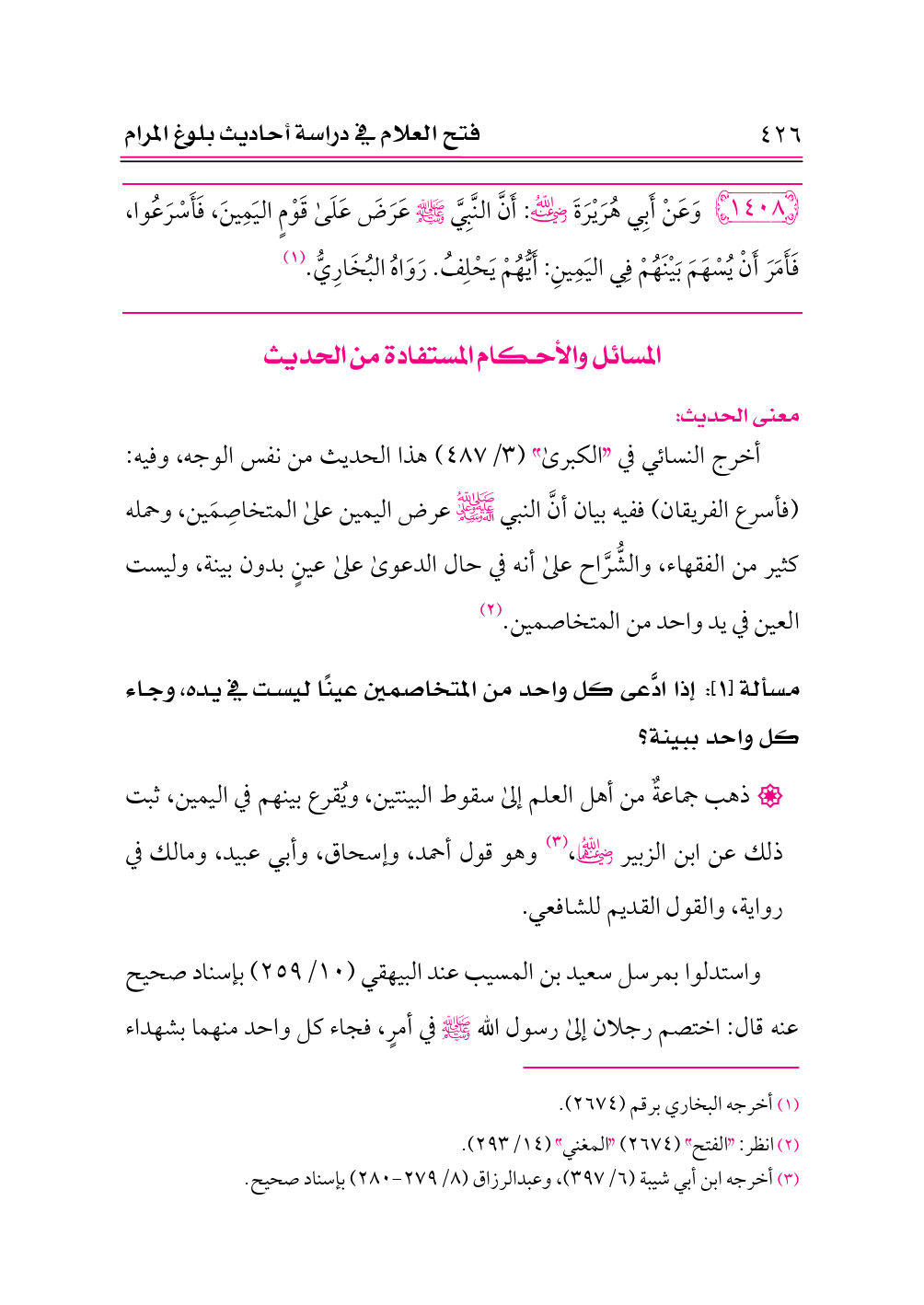 أخرج النسائي في «الكبرى» (٣/ ٤٨٧) هذا الحديث من نفس الوجه، وفيه: (فأسرع الفريقان) ففيه بيان أنَّ النبي -صلى الله عليه وعلى آله وسلم- عرض اليمين على المتخاصِمَين، وحمله كثير من الفقهاء، والشُّرَّاح على أنه في حال الدعوى على عينٍ بدون بينة، وليست العين في يد واحد من المتخاصمين. (¬٢)