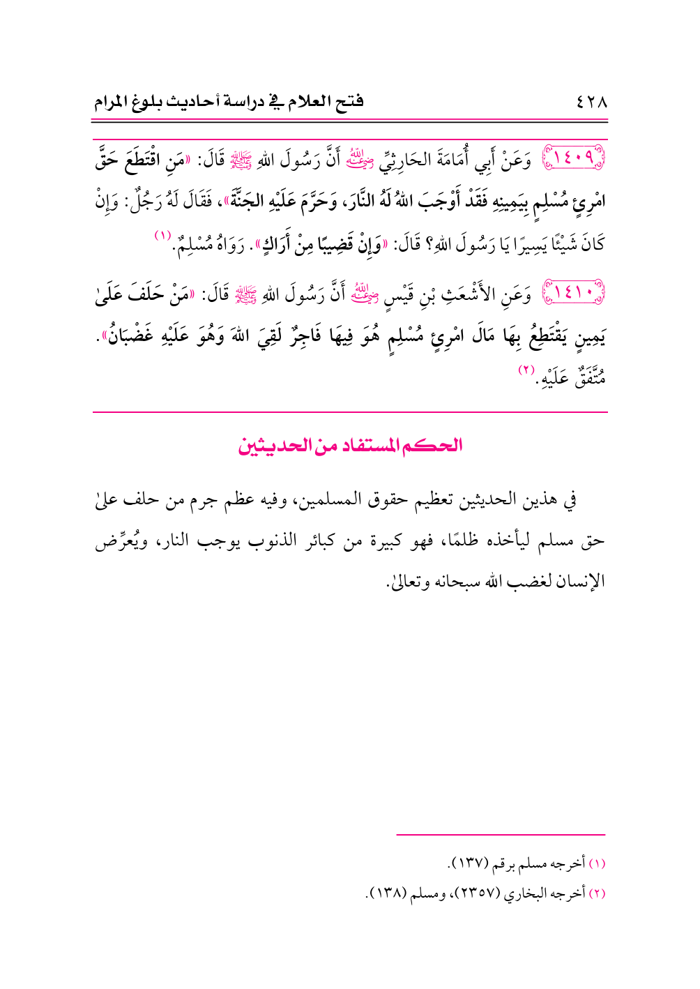 ١٤١٠ - وَعَنِ الأَشْعَثِ بْنِ قَيْسٍ -رضي الله عنه- أَنَّ رَسُولَ اللهِ - صلى الله عليه وسلم - قَالَ: «مَنْ حَلَفَ عَلَى يَمِينٍ يَقْتَطِعُ بِهَا مَالَ امْرِئٍ مُسْلِمٍ هُوَ فِيهَا فَاجِرٌ لَقِيَ اللهَ وَهُوَ عَلَيْهِ غَضْبَانُ». مُتَّفَقٌ عَلَيْهِ. (¬٢)
