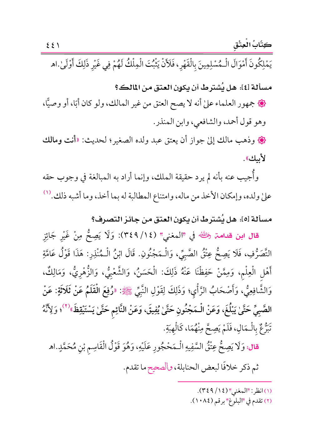 قال ابن قدامة -رحمه الله- في «المغني» (١٤/ ٣٤٩): وَلَا يَصِحُّ مِنْ غَيْرِ جَائِزِ التَّصَرُّفِ، فَلَا يَصِحُّ عِتْقُ الصَّبِيِّ، وَالْمَجْنُونِ. قَالَ ابْنُ الْمُنْذِرِ: هَذَا قَوْلُ عَامَّةِ أَهْلِ الْعِلْمِ، وَمِمَّنْ حَفِظْنَا عَنْهُ ذَلِكَ: الْحَسَنُ، وَالشَّعْبِيُّ، وَالزُّهْرِيُّ، وَمَالِكٌ، وَالشَّافِعِيُّ، وَأَصْحَابُ الرَّأْيِ؛ وَذَلِكَ لِقَوْلِ النَّبِيِّ - صلى الله عليه وسلم -: «رُفِعَ الْقَلَمُ عَنْ ثَلَاثَةٍ: عَنْ الصَّبِيِّ حَتَّى يَبْلُغَ، وَعَنْ الْمَجْنُونِ حَتَّى يُفِيقَ، وَعَنْ النَّائِمِ حَتَّى يَسْتَيْقِظَ» (¬٢)؛ وَلِأَنَّهُ تَبَرُّعٌ بِالْمَالِ، فَلَمْ يَصِحَّ مِنْهُمَا، كَالْهِبَةِ.