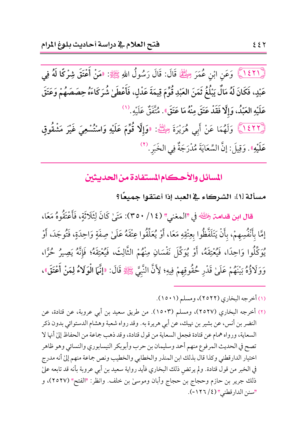 (¬٢) أخرجه البخاري (٢٥٢٧)، ومسلم (١٥٠٣). من طريق سعيد بن أبي عروبة، عن قتادة، عن النضر بن أنس، عن بشير بن نهيك، عن أبي هريرة به. وقد رواه شعبة وهشام الدستوائي بدون ذكر السعاية، ورواه همام عن قتادة فجعل السعاية من قول قتادة، وقد ذهب جماعة من الحفاظ إلى أنها لا تصح في الحديث المرفوع منهم أحمد وسليمان بن حرب وأبوبكر النيسابوري والنسائي وهو ظاهر اختيار الدارقطني وكذا قال بذلك ابن المنذر والخطابي والخطيب ونص جماعة منهم إلى أنه مدرج في الخبر من قول قتادة. ولم يرتضِ ذلك البخاري فأيد رواية سعيد بن أبي عروبة بأنه قد تابعه على ذلك جرير بن حازم وحجاج بن حجاج وأبان وموسى بن خلف. وانظر: «الفتح» (٢٥٢٧)، و «سنن الدارقطني» (٤/ ١٢٦).