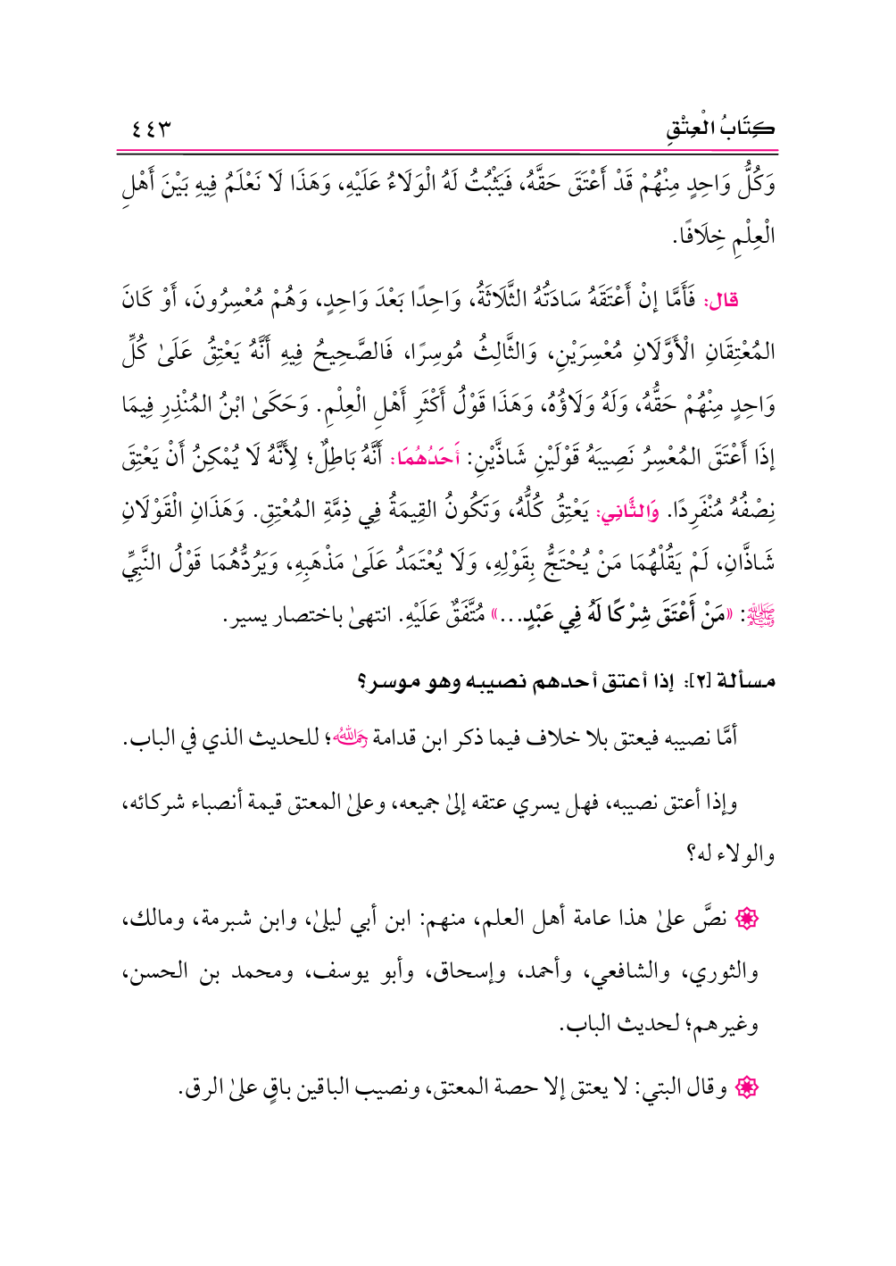 وإذا أعتق نصيبه، فهل يسري عتقه إلى جميعه، وعلى المعتق قيمة أنصباء شركائه، والولاء له؟