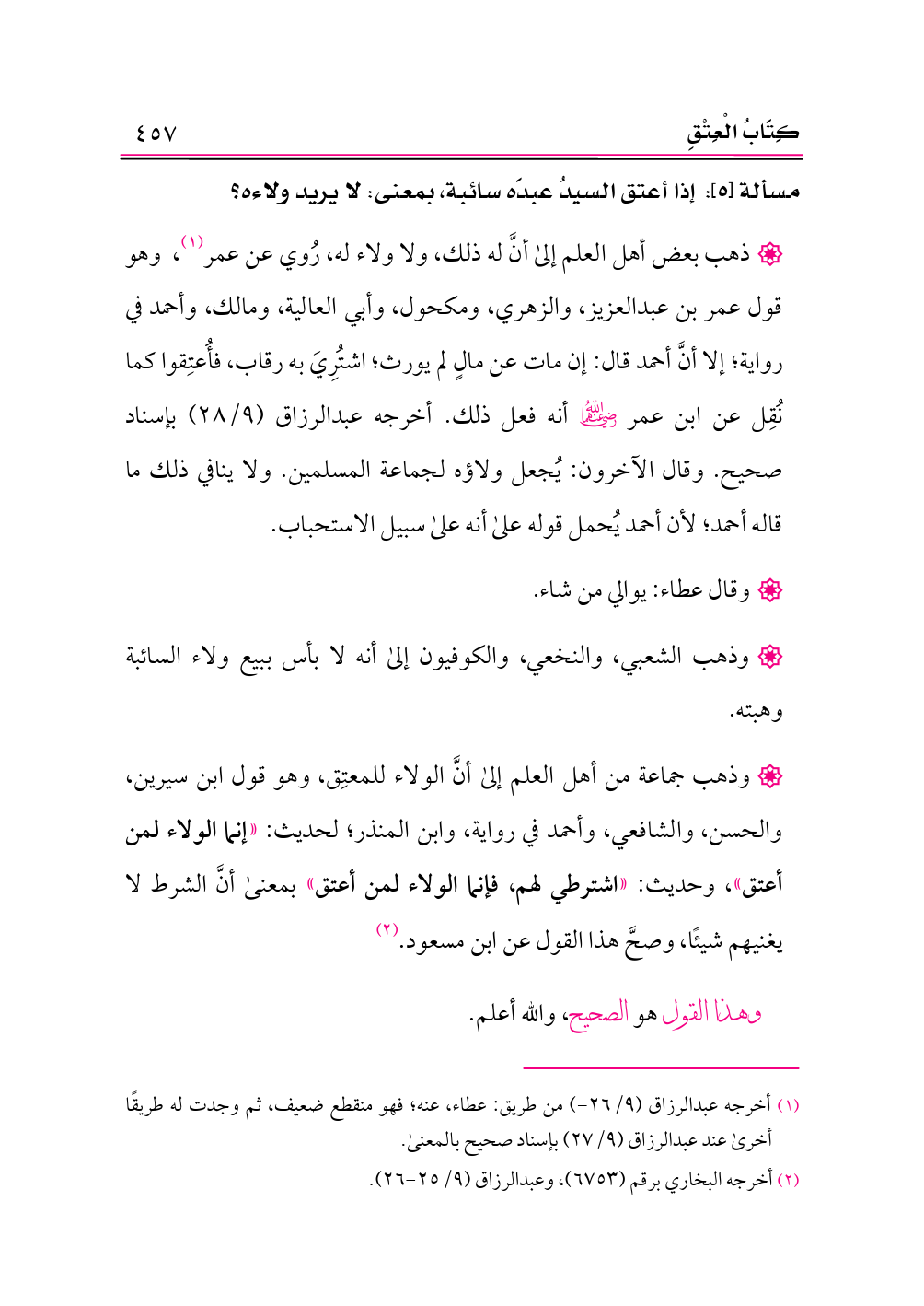 • ذهب بعض أهل العلم إلى أنَّ له ذلك، ولا ولاء له، رُوي عن عمر (¬١)، وهو قول عمر بن عبدالعزيز، والزهري، ومكحول، وأبي العالية، ومالك، وأحمد في رواية؛ إلا أنَّ أحمد قال: إن مات عن مالٍ لم يورث؛ اشتُرِيَ به رقاب، فأُعتِقوا كما نُقِل عن ابن عمر -رضي الله عنهما- أنه فعل ذلك. أخرجه عبدالرزاق (٩/ ٢٨) بإسناد صحيح. وقال الآخرون: يُجعل ولاؤه لجماعة المسلمين. ولا ينافي ذلك ما قاله أحمد؛ لأن أحمد يُحمل قوله على أنه على سبيل الاستحباب.