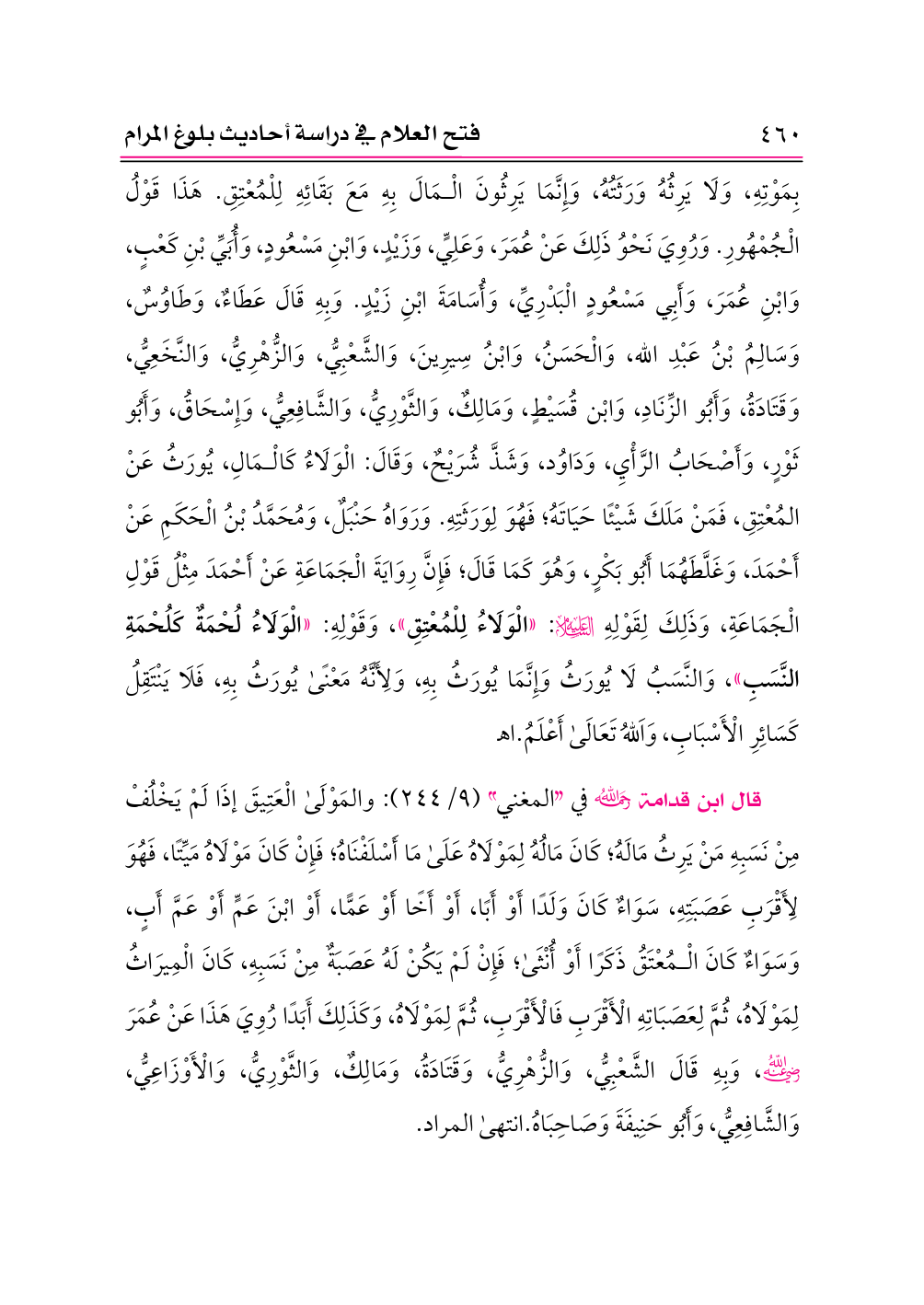قال ابن قدامة -رحمه الله- في «المغني» (٩/ ٢٤٤): والمَوْلَى الْعَتِيقَ إذَا لَمْ يَخْلُفْ مِنْ نَسَبِهِ مَنْ يَرِثُ مَالَهُ؛ كَانَ مَالُهُ لِمَوْلَاهُ عَلَى مَا أَسْلَفْنَاهُ؛ فَإِنْ كَانَ مَوْلَاهُ مَيِّتًا، فَهُوَ لِأَقْرَبِ عَصَبَتِهِ، سَوَاءٌ كَانَ وَلَدًا أَوْ أَبًا، أَوْ أَخًا أَوْ عَمًّا، أَوْ ابْنَ عَمٍّ أَوْ عَمَّ أَبٍ، وَسَوَاءٌ كَانَ الْمُعْتَقُ ذَكَرًا أَوْ أُنْثَى؛ فَإِنْ لَمْ يَكُنْ لَهُ عَصَبَةٌ مِنْ نَسَبِهِ، كَانَ الْمِيرَاثُ لِمَوْلَاهُ، ثُمَّ لِعَصَبَاتِهِ الْأَقْرَبِ فَالْأَقْرَبِ، ثُمَّ لِمَوْلَاهُ، وَكَذَلِكَ أَبَدًا رُوِيَ هَذَا عَنْ عُمَرَ -رضي الله عنه-، وَبِهِ قَالَ الشَّعْبِيُّ، وَالزُّهْرِيُّ، وَقَتَادَةُ، وَمَالِكٌ، وَالثَّوْرِيُّ، وَالْأَوْزَاعِيُّ، وَالشَّافِعِيُّ، وَأَبُو حَنِيفَةَ وَصَاحِبَاهُ. انتهى المراد.