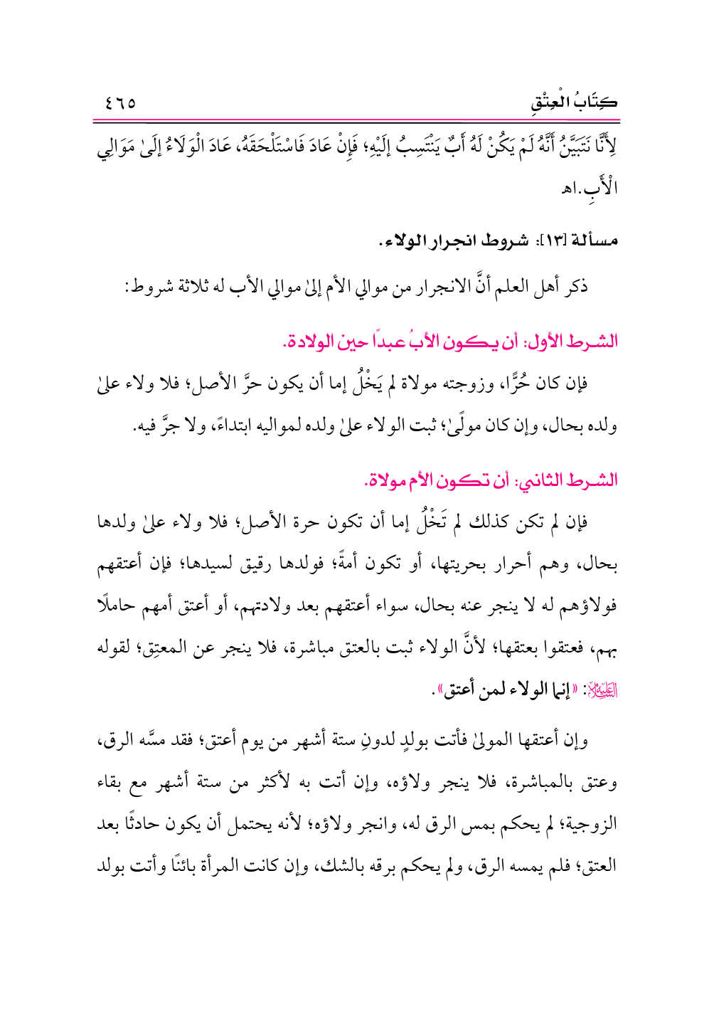 ذكر أهل العلم أنَّ الانجرار من موالي الأم إلى موالي الأب له ثلاثة شروط: