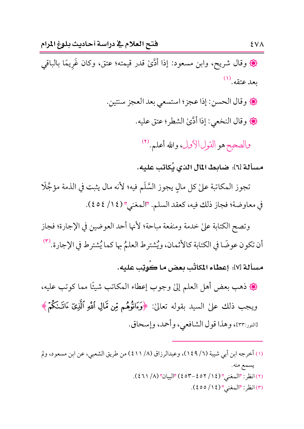 • ذهب بعض أهل العلم إلى وجوب إعطاء المكاتب شيئًا مما كوتب عليه، ويجب ذلك على السيد بقوله تعالى: {وَآتُوهُمْ مِنْ مَالِ اللَّهِ الَّذِي آتَاكُمْ} [النور:٣٣]، وهذا قول الشافعي، وأحمد، وإسحاق.