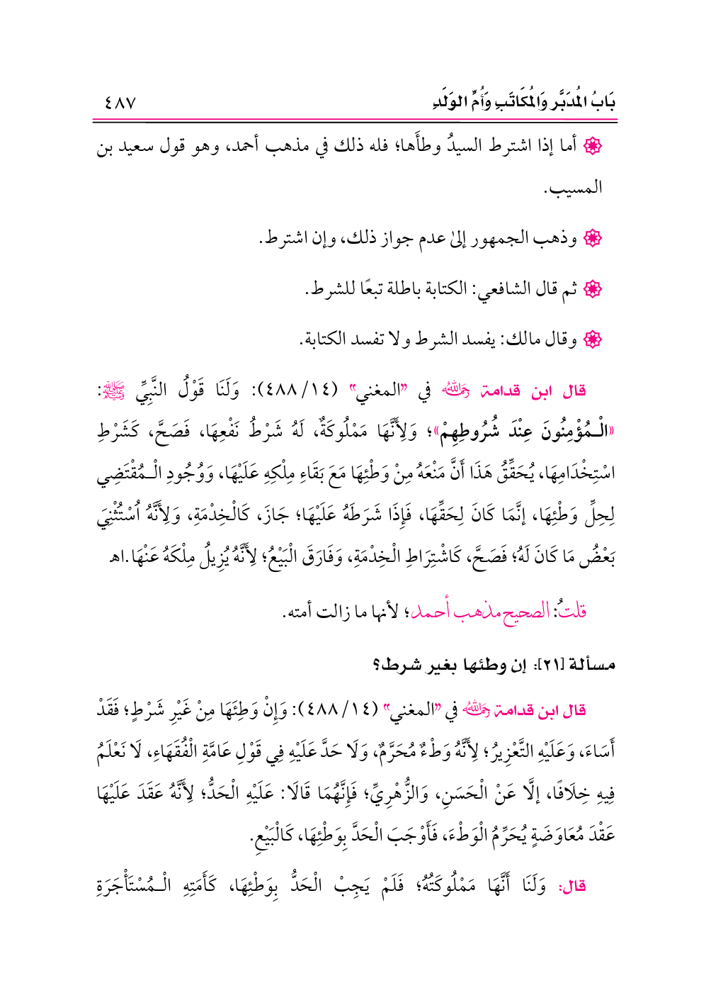 • أما إذا اشترط السيدُ وطأَها؛ فله ذلك في مذهب أحمد، وهو قول سعيد بن المسيب.