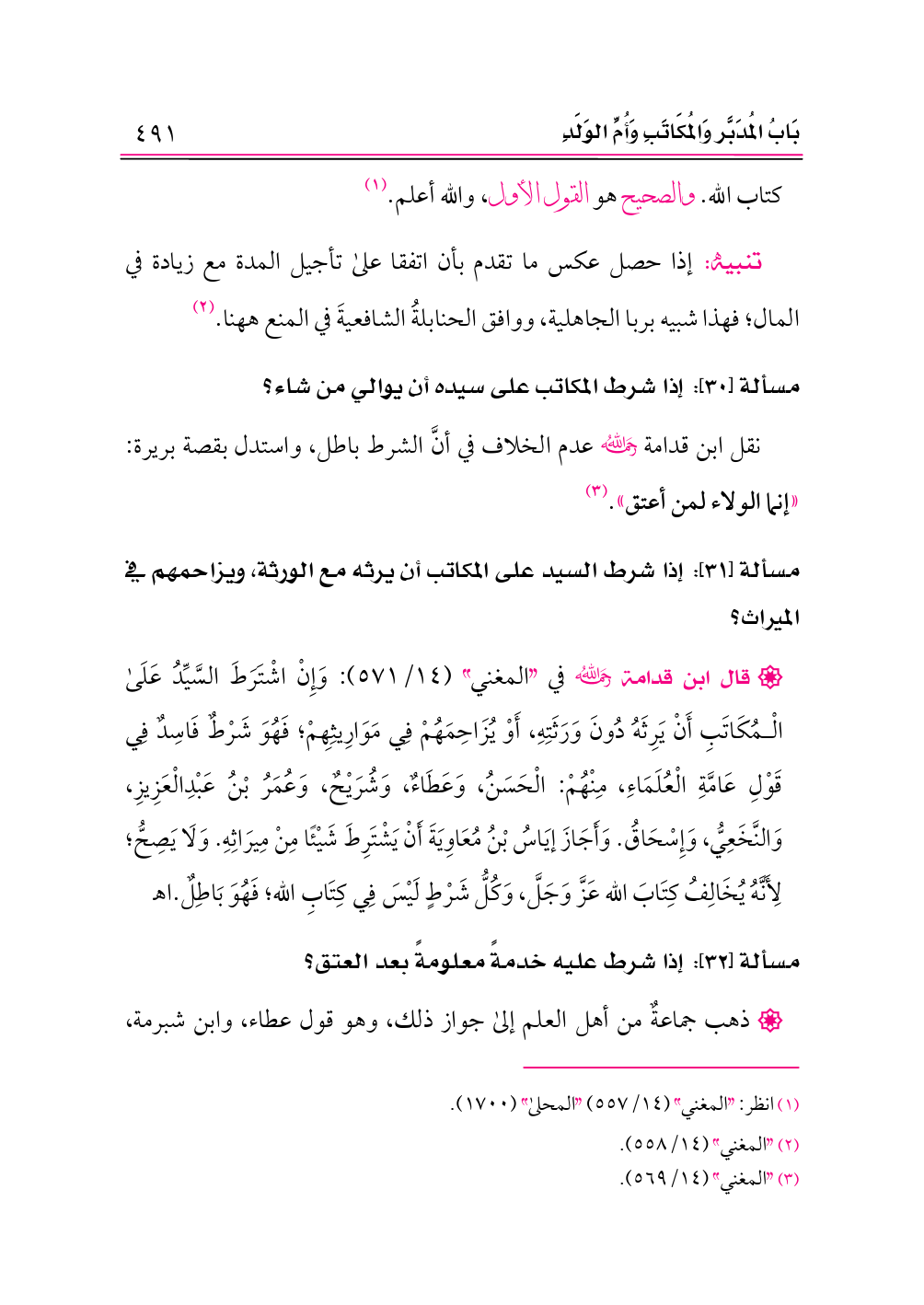 • قال ابن قدامة -رحمه الله- في «المغني» (١٤/ ٥٧١): وَإِنْ اشْتَرَطَ السَّيِّدُ عَلَى الْمُكَاتَبِ أَنْ يَرِثَهُ دُونَ وَرَثَتِهِ، أَوْ يُزَاحِمَهُمْ فِي مَوَارِيثِهِمْ؛ فَهُوَ شَرْطٌ فَاسِدٌ فِي قَوْلِ عَامَّةِ الْعُلَمَاءِ، مِنْهُمْ: الْحَسَنُ، وَعَطَاءٌ، وَشُرَيْحٌ، وَعُمَرُ بْنُ عَبْدِالْعَزِيزِ، وَالنَّخَعِيُّ، وَإِسْحَاقُ. وَأَجَازَ إيَاسُ بْنُ مُعَاوِيَةَ أَنْ يَشْتَرِطَ شَيْئًا مِنْ مِيرَاثِهِ. وَلَا يَصِحُّ؛ لِأَنَّهُ يُخَالِفُ كِتَابَ الله عَزَّ وَجَلَّ، وَكُلُّ شَرْطٍ لَيْسَ فِي كِتَابِ الله؛ فَهُوَ بَاطِلٌ. اهـ