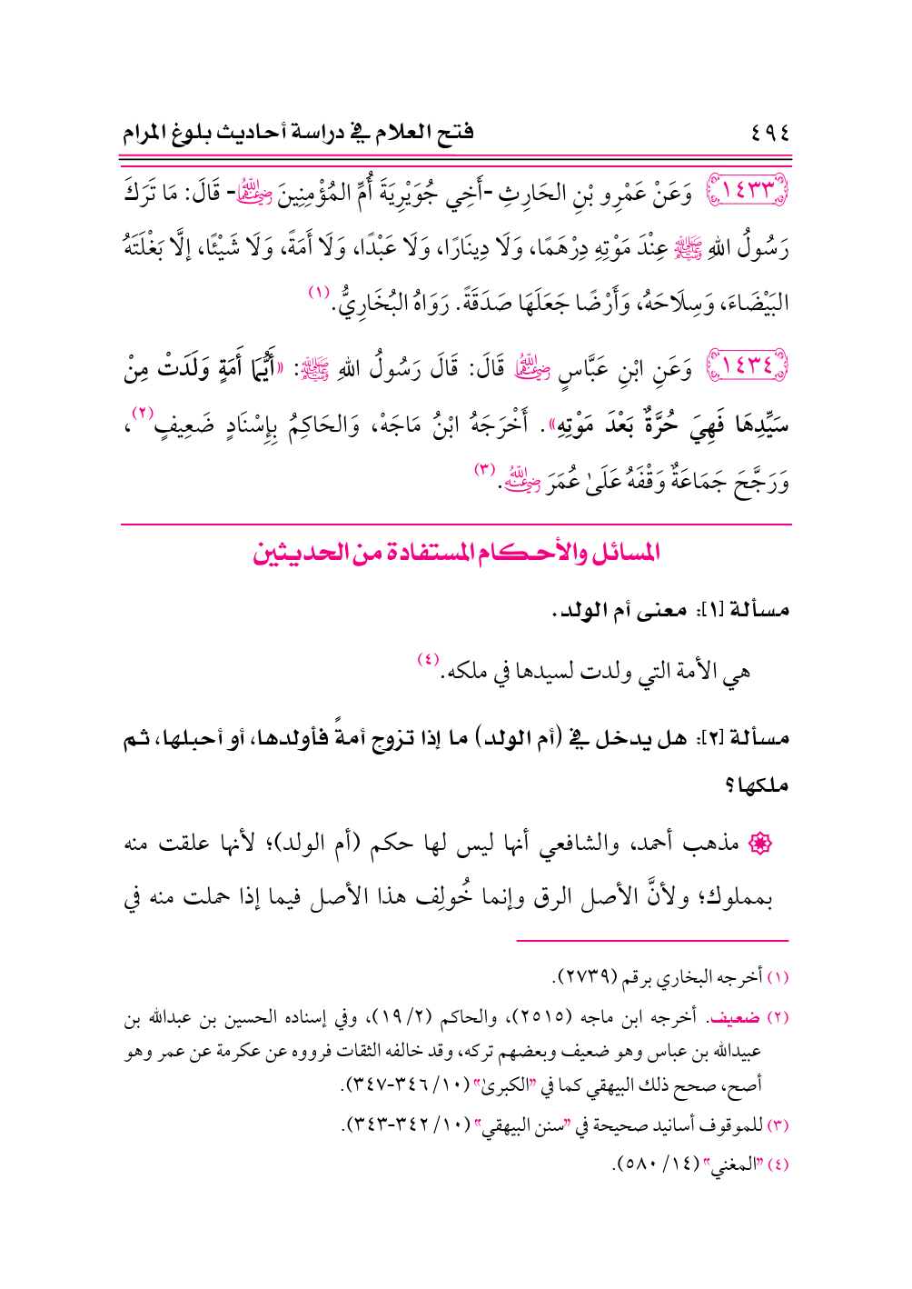١٤٣٤ - وَعَنِ ابْنِ عَبَّاسٍ -رضي الله عنهما- قَالَ: قَالَ رَسُولُ اللهِ - صلى الله عليه وسلم -: «أَيُّمَا أَمَةٍ وَلَدَتْ مِنْ سَيِّدِهَا فَهِيَ حُرَّةٌ بَعْدَ مَوْتِهِ». أَخْرَجَهُ ابْنُ مَاجَهْ، وَالحَاكِمُ بِإِسْنَادٍ ضَعِيفٍ (¬٢)، وَرَجَّحَ جَمَاعَةٌ وَقْفَهُ عَلَى عُمَرَ -رضي الله عنه-. (¬٣)