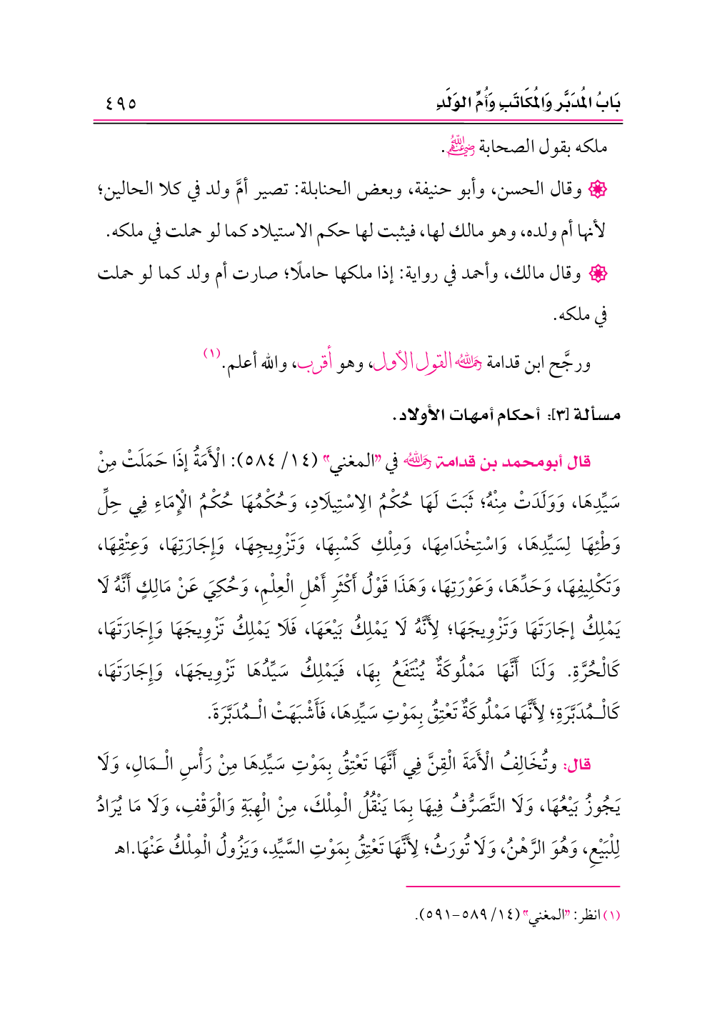• وقال مالك، وأحمد في رواية: إذا ملكها حاملًا؛ صارت أم ولد كما لو حملت في ملكه.