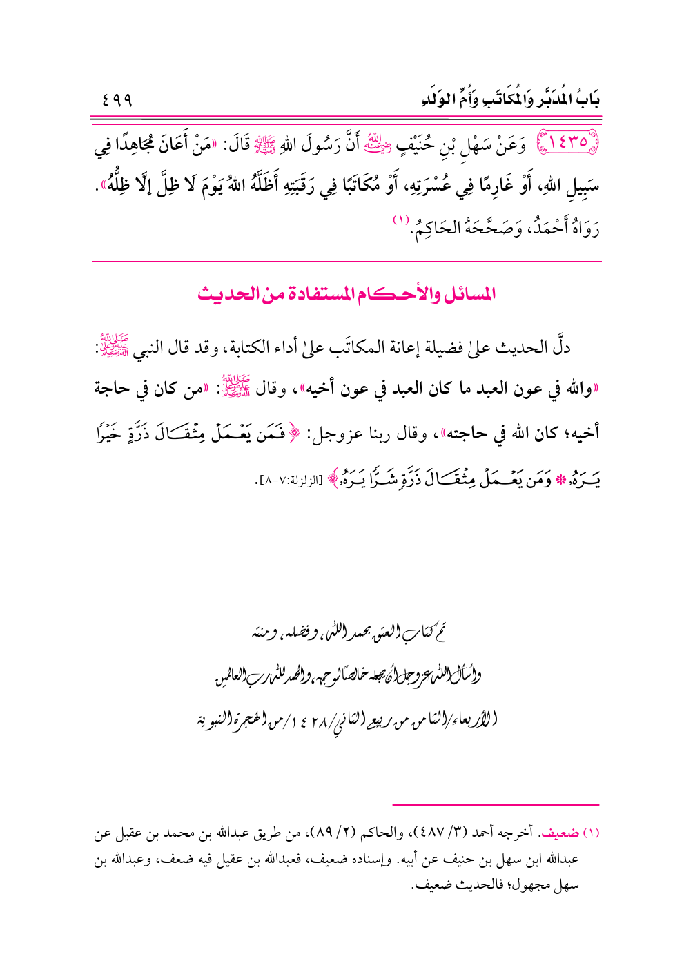 ١٤٣٥ - وَعَنْ سَهْلِ بْنِ حُنَيْفٍ -رضي الله عنه- أَنَّ رَسُولَ اللهِ - صلى الله عليه وسلم - قَالَ: «مَنْ أَعَانَ مُجَاهِدًا فِي سَبِيلِ اللهِ، أَوْ غَارِمًا فِي عُسْرَتِهِ، أَوْ مُكَاتَبًا فِي رَقَبَتِهِ أَظَلَّهُ اللهُ يَوْمَ لَا ظِلَّ إلَّا ظِلُّهُ». رَوَاهُ أَحْمَدُ، وَصَحَّحَهُ الحَاكِمُ. (¬١)