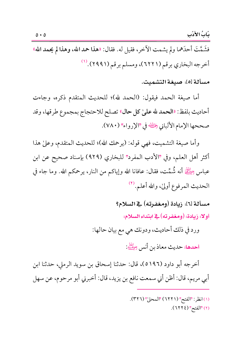 فشَمَّتَ أحدَهما ولم يشمت الآخر، فقيل له. فقال: «هذا حمد الله، وهذا لم يحمد الله» أخرجه البخاري برقم (٦٢٢١)، ومسلم برقم (٢٩٩١). (¬١)