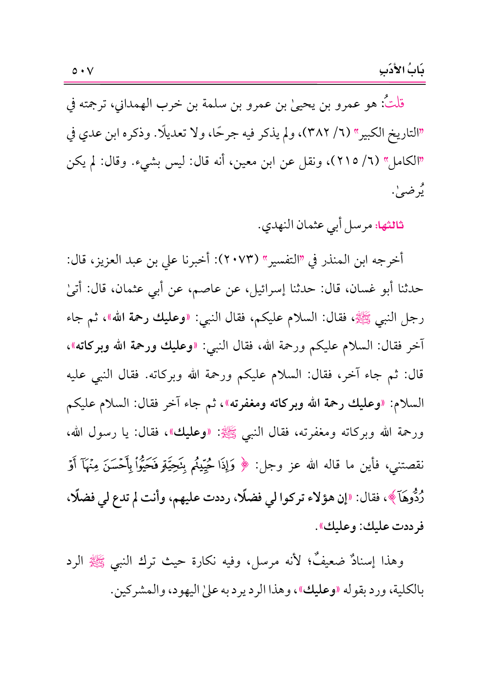 وهذا إسنادٌ ضعيفٌ؛ لأنه مرسل، وفيه نكارة حيث ترك النبي - صلى الله عليه وسلم - الرد بالكلية، ورد بقوله «وعليك»، وهذا الرد يرد به على اليهود، والمشركين.