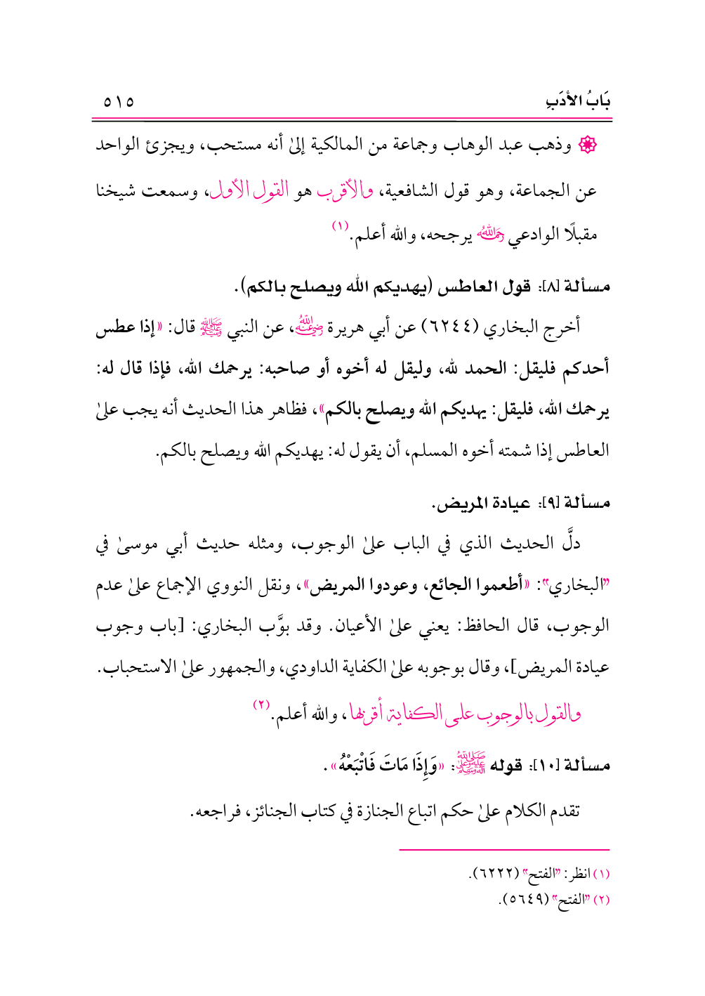 • وذهب عبد الوهاب وجماعة من المالكية إلى أنه مستحب، ويجزئ الواحد عن الجماعة، وهو قول الشافعية، والأقرب هو القول الأول، وسمعت شيخنا مقبلًا الوادعي -رحمه الله- يرجحه، والله أعلم. (¬١)