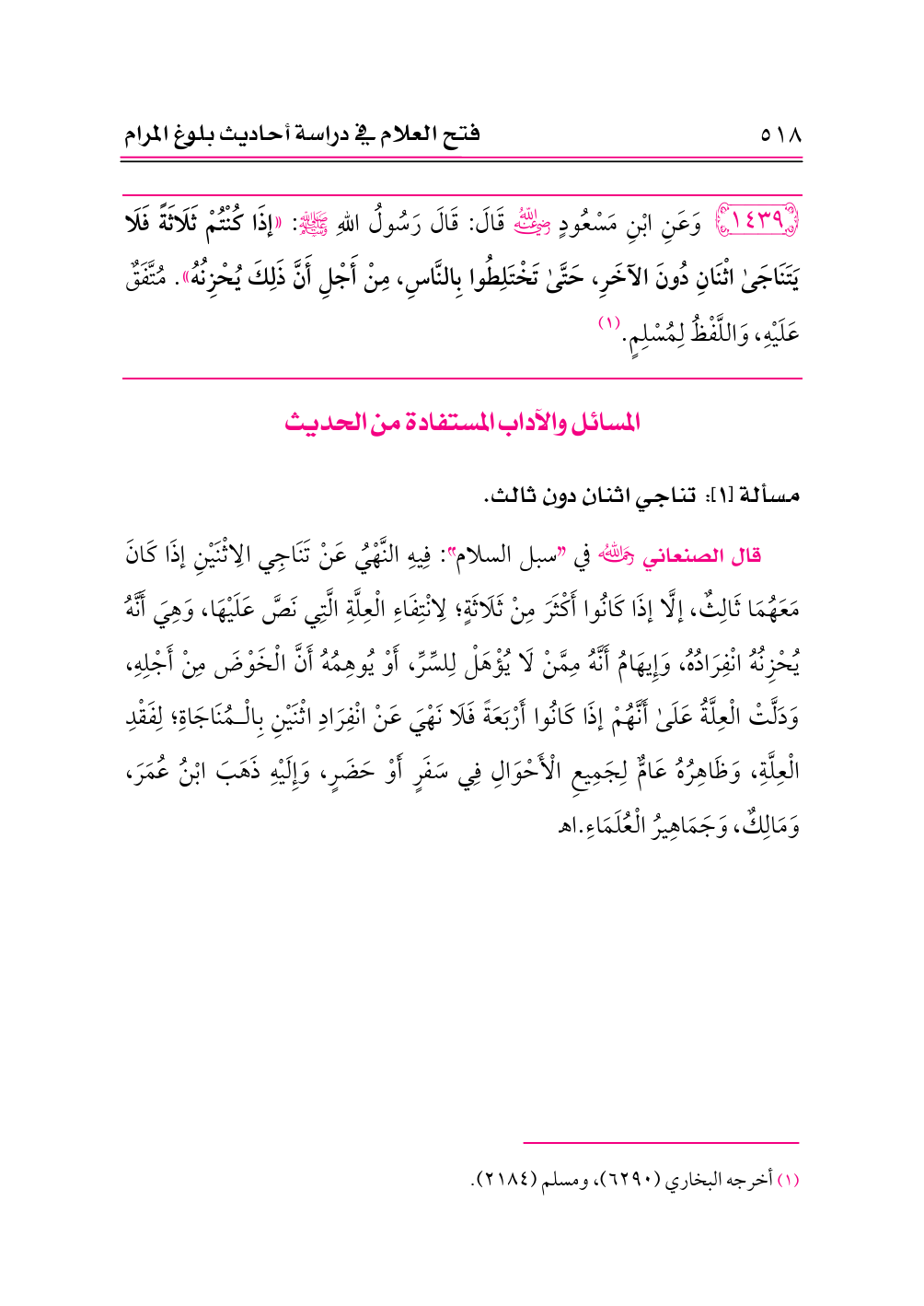 ١٤٣٩ - وَعَنِ ابْنِ مَسْعُودٍ -رضي الله عنه- قَالَ: قَالَ رَسُولُ اللهِ - صلى الله عليه وسلم -: «إذَا كُنْتُمْ ثَلَاثَةً فَلَا يَتَنَاجَى اثْنَانِ دُونَ الآخَرِ، حَتَّى تَخْتَلِطُوا بِالنَّاسِ، مِنْ أَجْلِ أَنَّ ذَلِكَ يُحْزِنُهُ». مُتَّفَقٌ عَلَيْهِ، وَاللَّفْظُ لِمُسْلِمٍ. (¬١)
