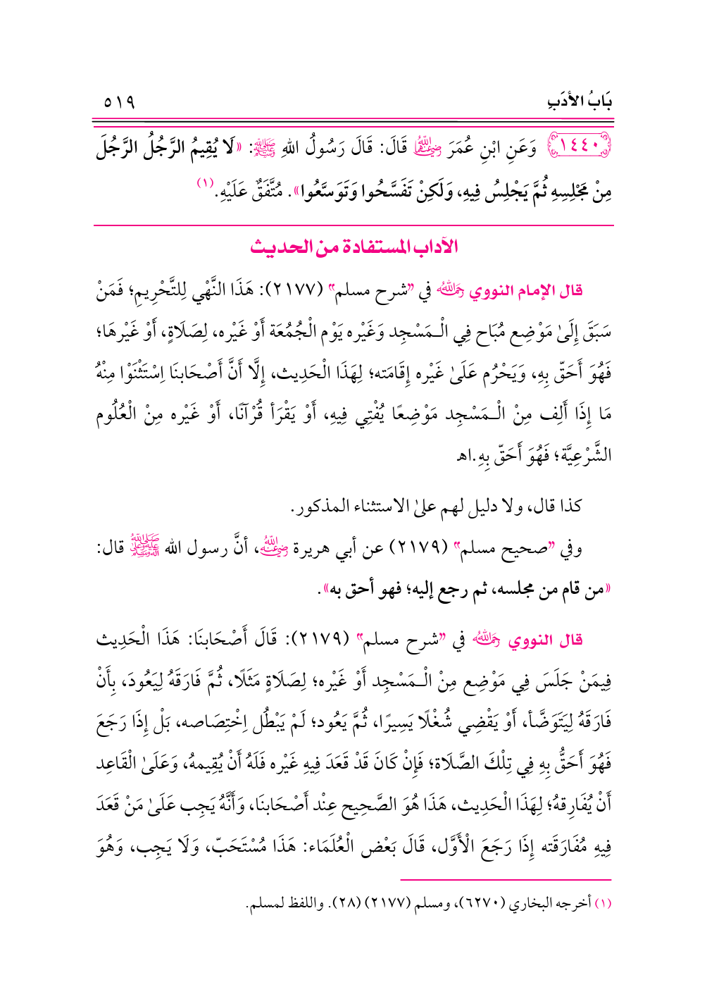 قال الإمام النووي -رحمه الله- في «شرح مسلم» (٢١٧٧): هَذَا النَّهْي لِلتَّحْرِيمِ؛ فَمَنْ سَبَقَ إِلَى مَوْضِع مُبَاح فِي الْمَسْجِد وَغَيْره يَوْم الْجُمُعَة أَوْ غَيْره، لِصَلَاةٍ، أَوْ غَيْرهَا؛ فَهُوَ أَحَقّ بِهِ، وَيَحْرُم عَلَى غَيْره إِقَامَته؛ لِهَذَا الْحَدِيث، إِلَّا أَنَّ أَصْحَابنَا اِسْتَثْنَوْا مِنْهُ مَا إِذَا أَلِف مِنْ الْمَسْجِد مَوْضِعًا يُفْتِي فِيهِ، أَوْ يَقْرَأ قُرْآنًا، أَوْ غَيْره مِنْ الْعُلُوم الشَّرْعِيَّة؛ فَهُوَ أَحَقّ بِهِ. اهـ