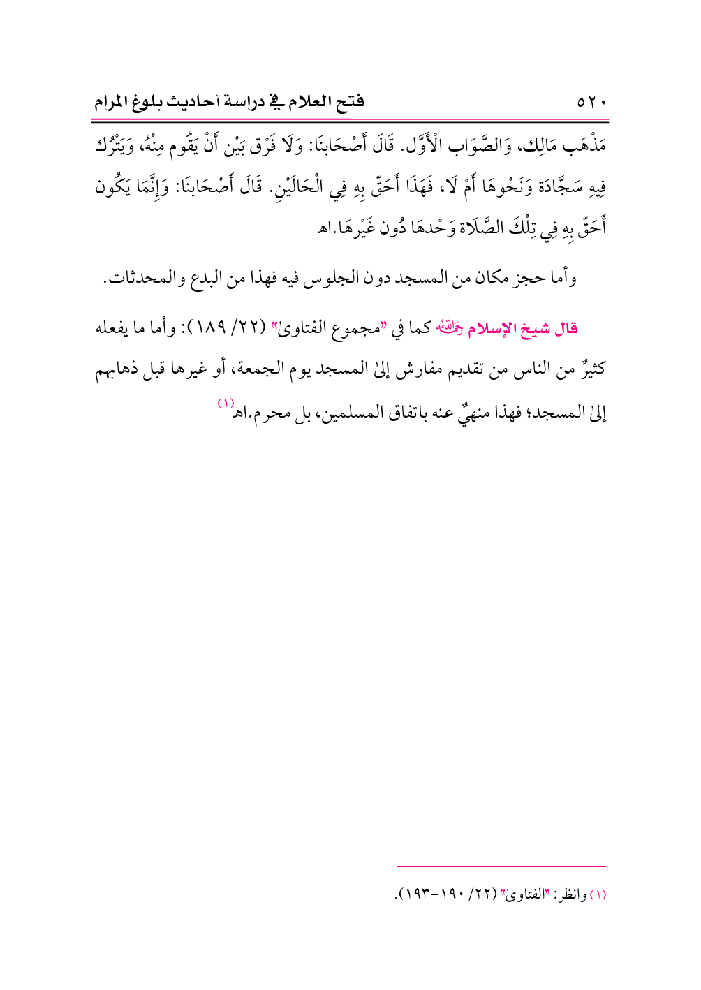 قال شيخ الإسلام -رحمه الله- كما في «مجموع الفتاوى» (٢٢/ ١٨٩): وأما ما يفعله كثيرٌ من الناس من تقديم مفارش إلى المسجد يوم الجمعة، أو غيرها قبل ذهابهم إلى المسجد؛ فهذا منهيٌ عنه باتفاق المسلمين، بل محرم. اهـ (¬١)