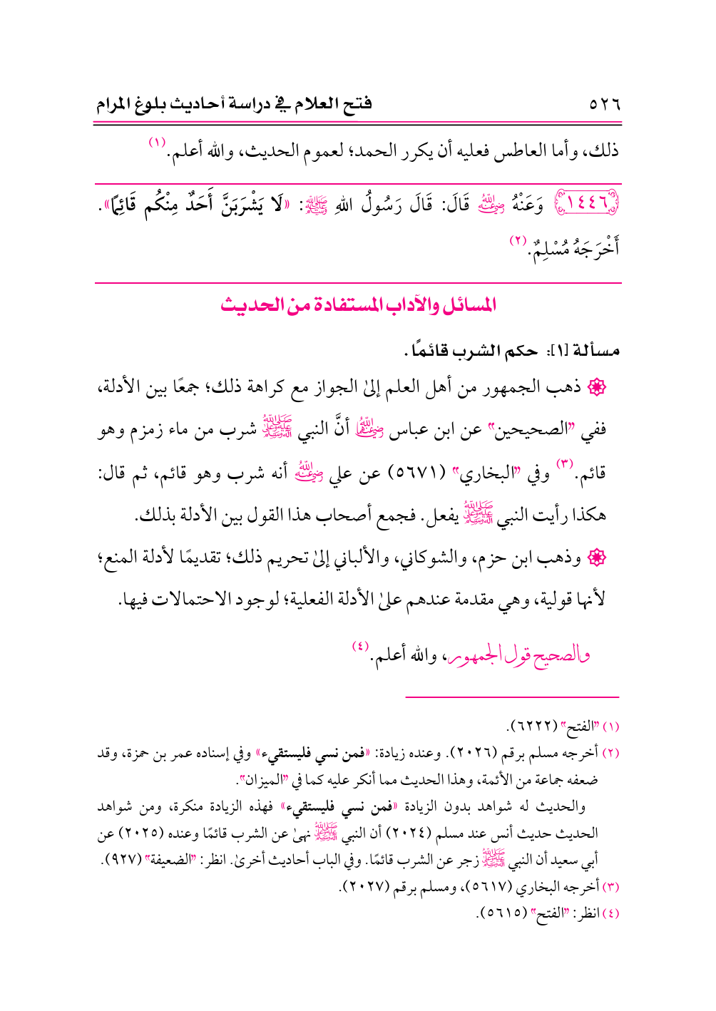 ١٤٤٦ - وَعَنْهُ -رضي الله عنه- قَالَ: قَالَ رَسُولُ اللهِ - صلى الله عليه وسلم -: «لَا يَشْرَبَنَّ أَحَدٌ مِنْكُم قَائِمًا». أَخْرَجَهُ مُسْلِمٌ. (¬٢)