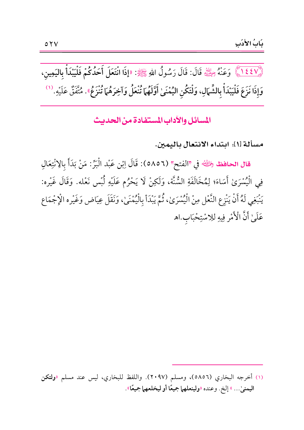 ١٤٤٧ - وَعَنْهُ -رضي الله عنه- قَالَ: قَالَ رَسُولُ اللهِ - صلى الله عليه وسلم -: «إذَا انْتَعَلَ أَحَدُكُمْ فَلْيَبْدَأْ بِاليَمِينِ، وَإِذَا نَزَعَ فَلْيَبْدَأْ بِالشِّمَالِ، وَلْتَكُنِ اليُمْنَى أَوَّلَهُمَا تُنْعَلُ وَآخِرَهُمَا تُنْزَعُ». مُتَّفَقٌ عَلَيْهِ. (¬١)