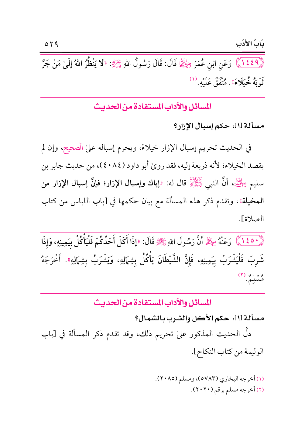 ١٤٤٩ - وَعَنِ ابْنِ عُمَرَ -رضي الله عنهما- قَالَ: قَالَ رَسُولُ اللهِ - صلى الله عليه وسلم -: «لَا يَنْظُرُ اللهُ إلَى مَنْ جَرَّ ثَوْبَهُ خُيَلَاءَ». مُتَّفَقٌ عَلَيْهِ. (¬١)