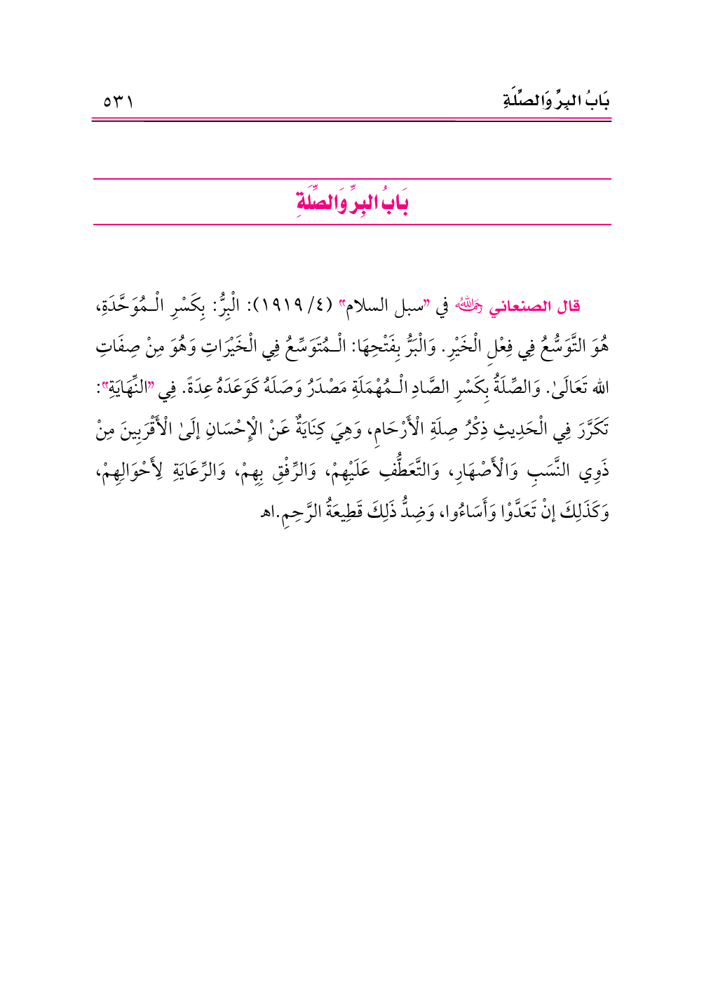 قال الصنعاني -رحمه الله- في «سبل السلام» (٤/ ١٩١٩): الْبِرُّ: بِكَسْرِ الْمُوَحَّدَةِ، هُوَ التَّوَسُّعُ فِي فِعْلِ الْخَيْرِ. وَالْبَرُّ بِفَتْحِهَا: الْمُتَوَسِّعُ فِي الْخَيْرَاتِ وَهُوَ مِنْ صِفَاتِ الله تَعَالَى. وَالصِّلَةُ بِكَسْرِ الصَّادِ الْمُهْمَلَةِ مَصْدَرُ وَصَلَهُ كَوَعَدَهُ عِدَةً. فِي «النِّهَايَةِ»: تَكَرَّرَ فِي الْحَدِيثِ ذِكْرُ صِلَةِ الْأَرْحَامِ، وَهِيَ كِنَايَةٌ عَنْ الْإِحْسَانِ إلَى الْأَقْرَبِينَ مِنْ ذَوِي النَّسَبِ وَالْأَصْهَارِ، وَالتَّعَطُّفِ عَلَيْهِمْ، وَالرِّفْقِ بِهِمْ، وَالرِّعَايَةِ لِأَحْوَالِهِمْ، وَكَذَلِكَ إنْ تَعَدَّوْا وَأَسَاءُوا، وَضِدُّ ذَلِكَ قَطِيعَةُ الرَّحِمِ. اهـ