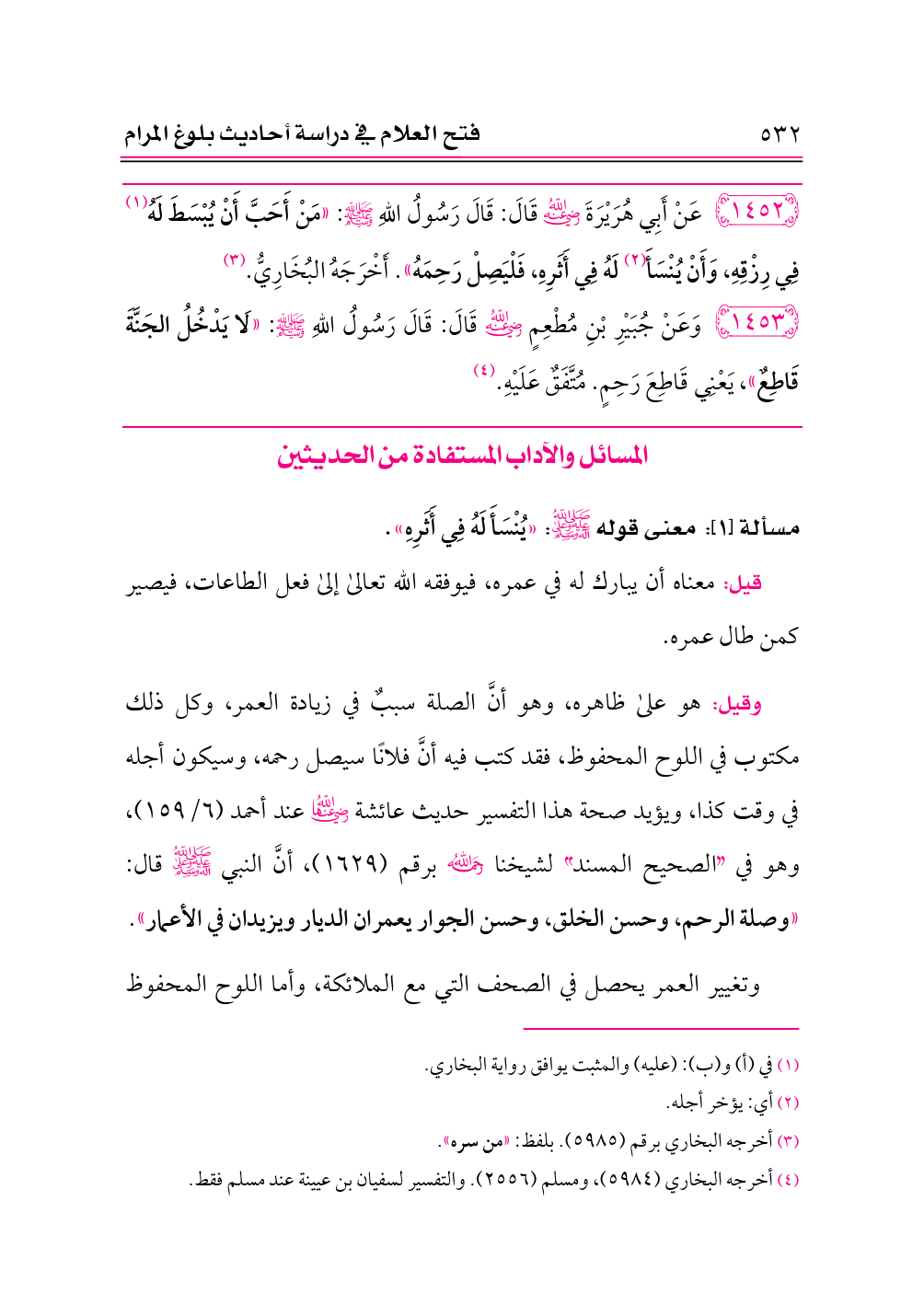 ١٤٥٢ - عَنْ أَبِي هُرَيْرَةَ -رضي الله عنه- قَالَ: قَالَ رَسُولُ اللهِ - صلى الله عليه وسلم -: «مَنْ أَحَبَّ أَنْ يُبْسَطَ لَهُ (¬١) فِي رِزْقِهِ، وَأَنْ يُنْسَأَ (¬٢) لَهُ فِي أَثَرِهِ، فَلْيَصِلْ رَحِمَهُ». أَخْرَجَهُ البُخَارِيُّ. (¬٣)