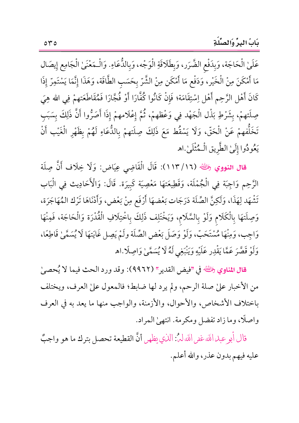 قال النووي -رحمه الله- (١٦/ ١١٣): قَالَ الْقَاضِي عِيَاض: وَلَا خِلَاف أَنَّ صِلَة الرَّحِم وَاجِبَة فِي الْجُمْلَة، وَقَطِيعَتهَا مَعْصِيَة كَبِيرَة. قَالَ: وَالْأَحَادِيث فِي الْبَاب تَشْهَد لِهَذَا، وَلَكِنَّ الصِّلَة دَرَجَات بَعْضهَا أَرْفَع مِنْ بَعْض، وَأَدْنَاهَا تَرْك المُهَاجَرَة، وَصِلَتهَا بِالْكَلَامِ وَلَوْ بِالسَّلَامِ، وَيَخْتَلِف ذَلِكَ بِاخْتِلَافِ الْقُدْرَة وَالْحَاجَة، فَمِنْهَا وَاجِب، وَمِنْهَا مُسْتَحَبّ، وَلَوْ وَصَلَ بَعْض الصِّلَة ولَمْ يَصِل غَايَتهَا لَا يُسَمَّى قَاطِعًا، وَلَوْ قَصَّرَ عَمَّا يَقْدِر عَلَيْهِ وَيَنْبَغِي لَهُ لَا يُسَمَّى وَاصِلًا. اهـ