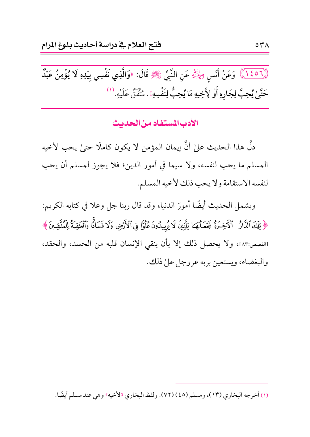 ١٤٥٦ - وَعَنْ أَنَسٍ -رضي الله عنه- عَنِ النَّبِيِّ - صلى الله عليه وسلم - قَالَ: «وَالَّذِي نَفْسِي بِيَدِهِ لَا يُؤْمِنُ عَبْدٌ حَتَّى يُحِبَّ لِجَارِهِ أَوْ لِأَخِيهِ مَا يُحِبُّ لِنَفْسِهِ». مُتَّفَقٌ عَلَيْهِ. (¬١)