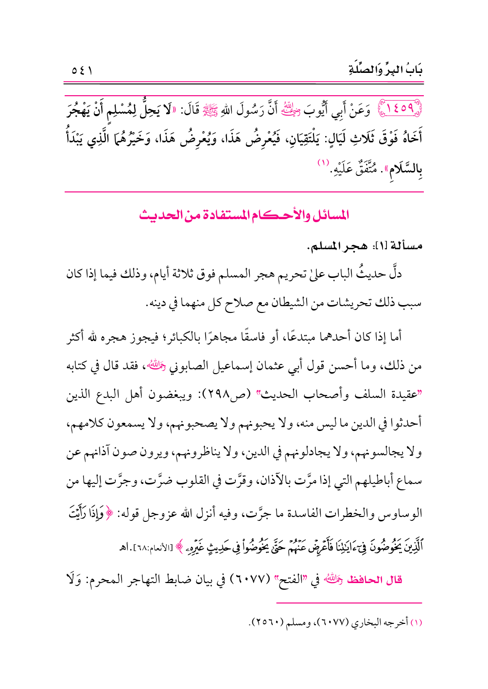 ١٤٥٩ - وَعَنْ أَبِي أَيُّوبَ -رضي الله عنه- أَنَّ رَسُولَ اللهِ - صلى الله عليه وسلم - قَالَ: «لَا يَحِلُّ لِمُسْلِمٍ أَنْ يَهْجُرَ أَخَاهُ فَوْقَ ثَلَاثِ لَيَالٍ: يَلْتَقِيَانِ، فَيُعْرِضُ هَذَا، وَيُعْرِضُ هَذَا، وَخَيْرُهُمَا الَّذِي يَبْدَأُ بِالسَّلَامِ». مُتَّفَقٌ عَلَيْهِ. (¬١)