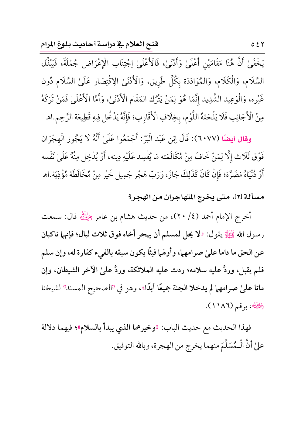 فهذا الحديث مع حديث الباب: «وخيرهما الذي يبدأ بالسلام»؛ فيهما دلالة على أنَّ الْمُسَلِّمَ منهما يخرج من الهجرة، وبالله التوفيق.