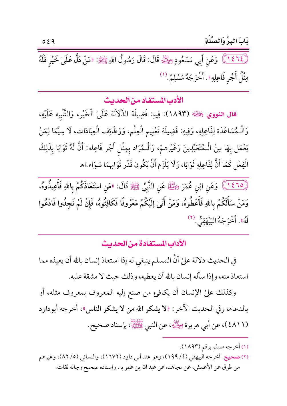 ١٤٦٥ - وَعَنِ ابْنِ عُمَرَ -رضي الله عنهما- عَنِ النَّبِيِّ - صلى الله عليه وسلم - قَالَ: «مَنِ اسْتَعَاذَكُمْ بِاللهِ فَأَعِيذُوهُ، وَمَنْ سَأَلَكُمْ بِاللهِ فَأَعْطُوهُ، وَمَنْ أَتَى إلَيْكُمْ مَعْرُوفًا فَكَافِئُوهُ، فَإِنْ لَمْ تَجِدُوا فَادْعُوا لَهُ». أَخْرَجَهُ البَيْهَقِيُّ. (¬٢)