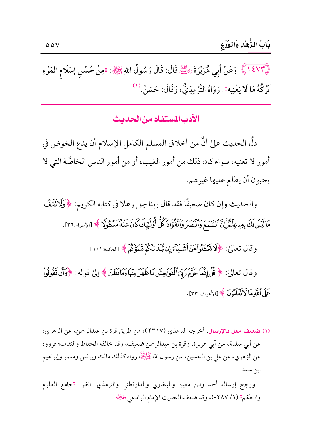 ١٤٧٣ - وَعَنْ أَبِي هُرَيْرَةَ -رضي الله عنه- قَالَ: قَالَ رَسُولُ اللهِ - صلى الله عليه وسلم -: «مِنْ حُسْنِ إسْلَامِ المَرْءِ تَرْكُهُ مَا لَا يَعْنِيه». رَوَاهُ التِّرْمِذِيُّ، وَقَالَ: حَسَنٌ. (¬١)